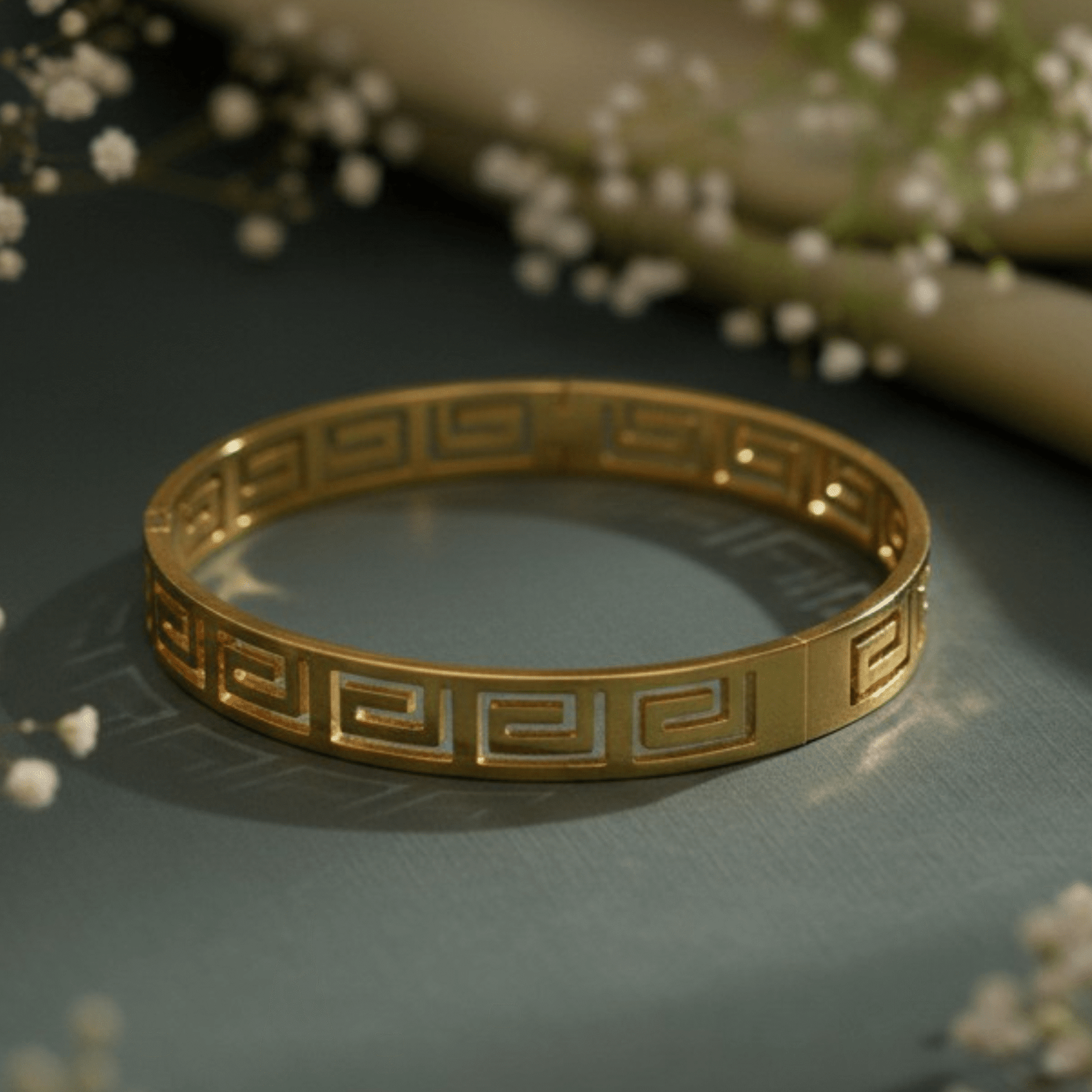 Inspired by ancient elegance, the Aureus Key bracelet features the iconic Greek key motif—symbolizing infinity, unity, and strength. Crafted in radiant gold tone, this piece blends classical artistry with modern minimalism. Whether paired with ethnic wear or contemporary outfits, it adds a touch of heritage sophistication to your wrist.