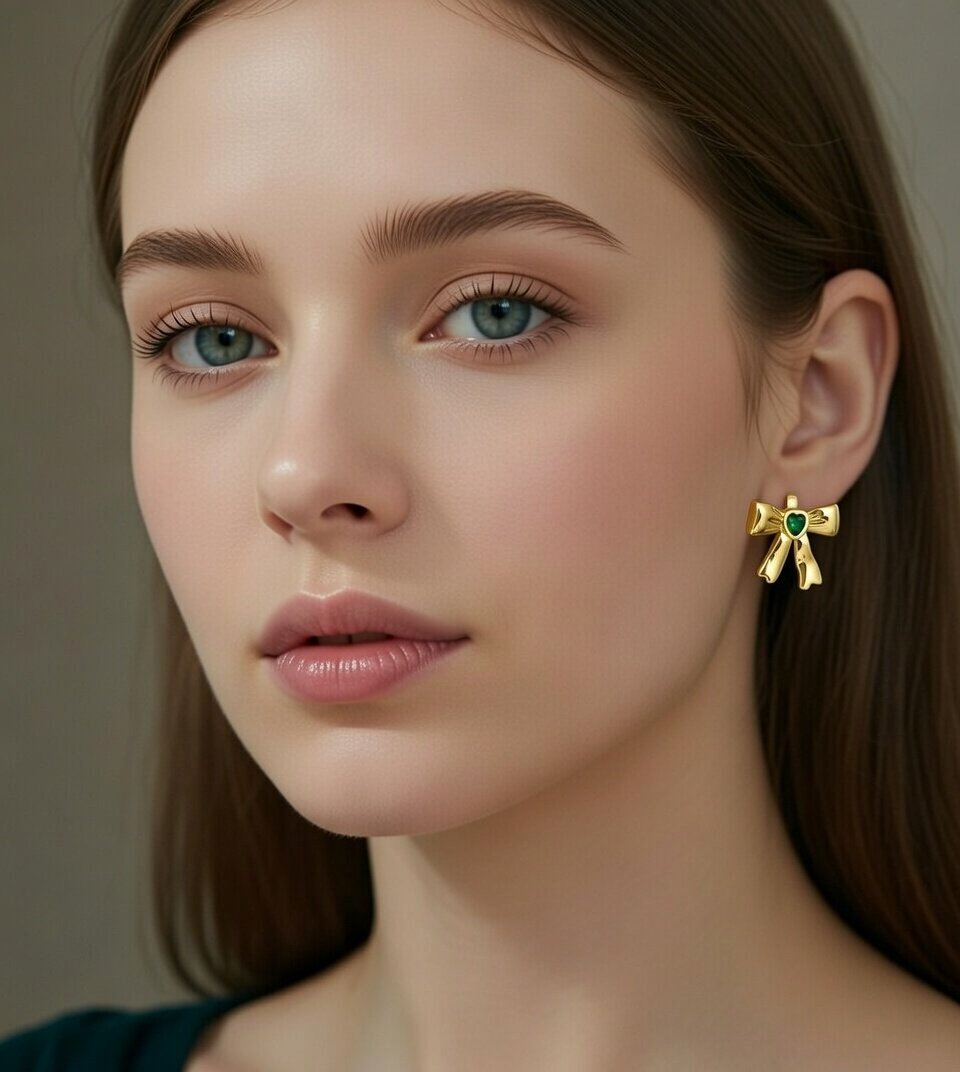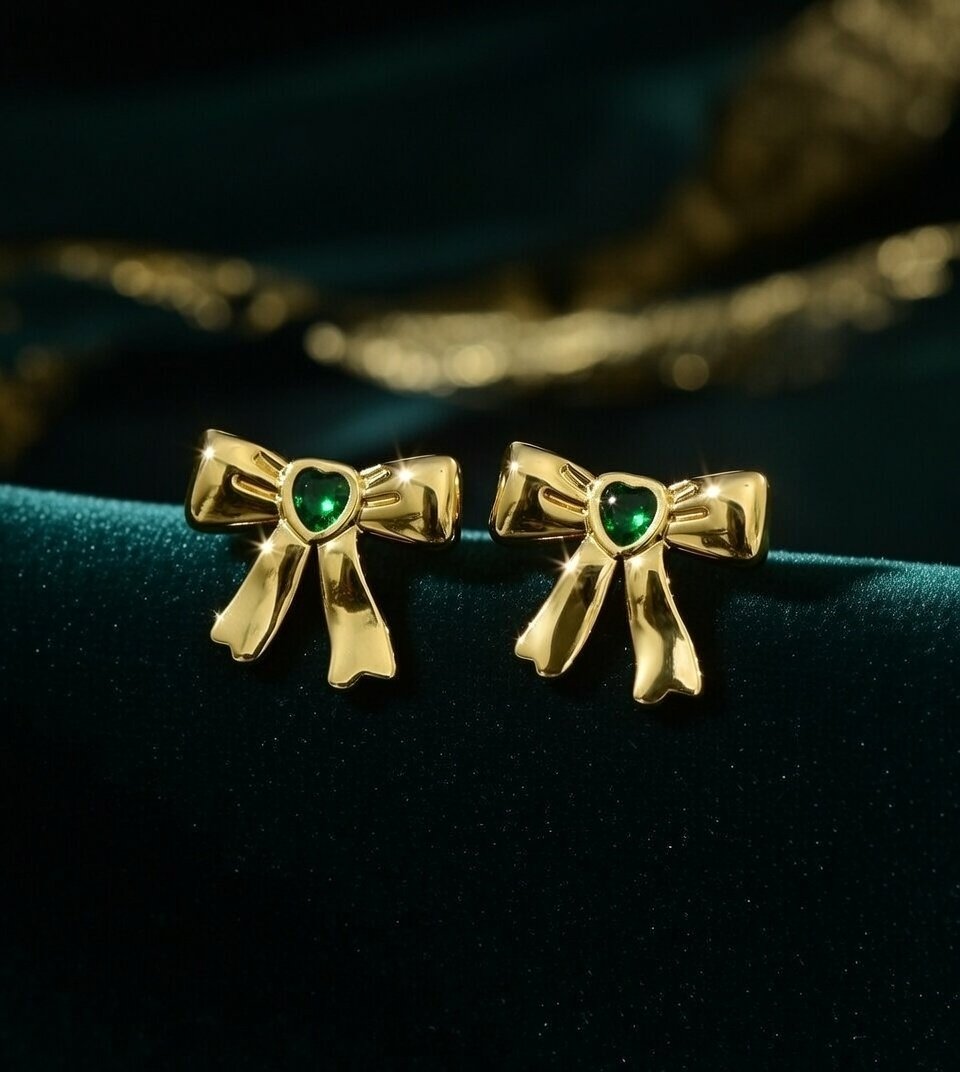 Turn heads with the Aurum Verdé Bows, a pair of gold-toned earrings that fuse whimsical design with luxe detailing. Each bow-shaped stud features a vibrant green heart-cut gem at its center, adding a bold splash of color against the polished gold finish. The symmetrical silhouette and smooth contours make these earrings a perfect blend of playful charm and refined elegance—ideal for festive wear, romantic outings, or everyday sparkle.