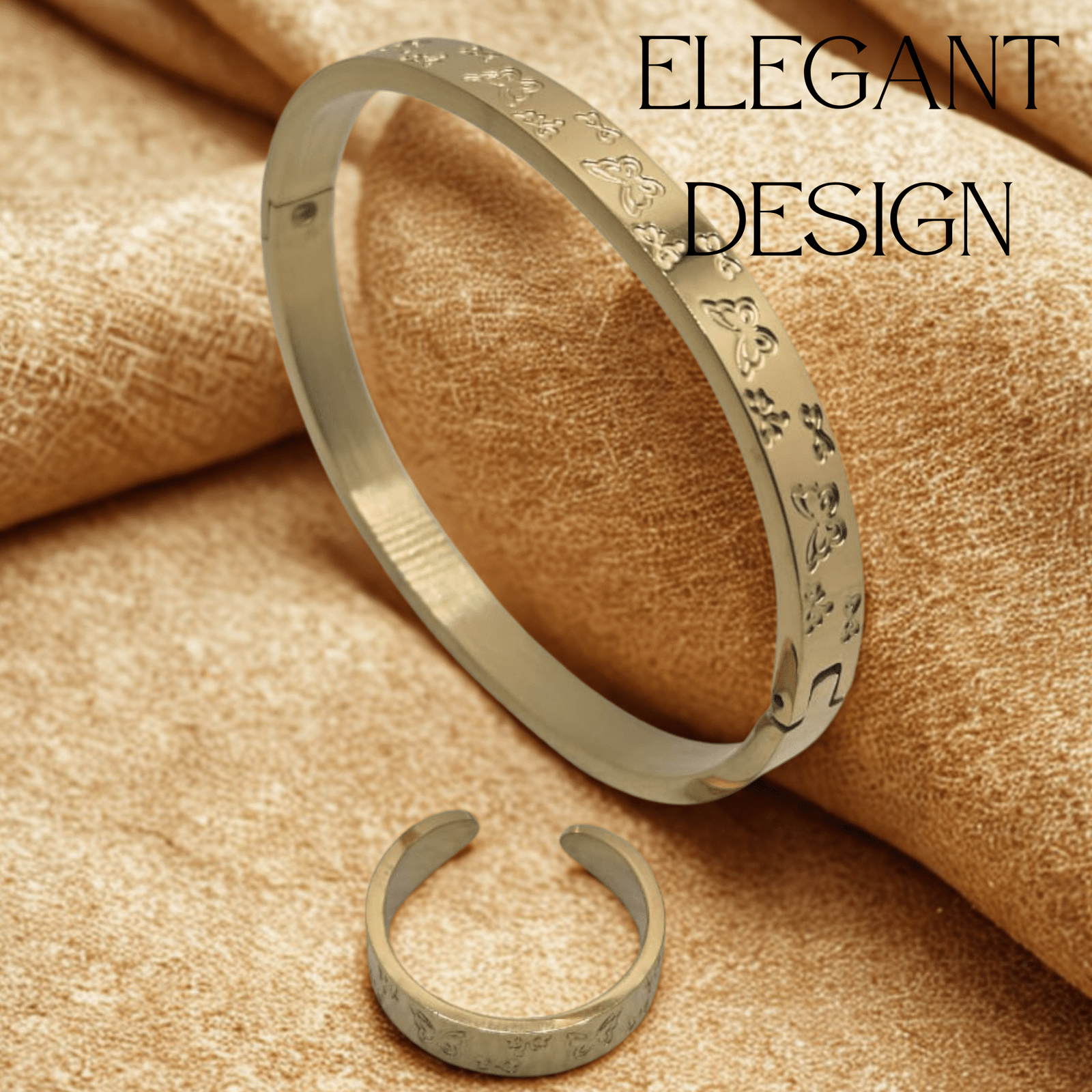 Let your elegance take flight with the Butterfly Bloom Set by Just Jewel. This coordinated duo features a hinged gold bracelet and matching open-ended ring, each engraved with delicate floral and butterfly motifs. Designed to evoke nature’s quiet grace, the set rests on soft fabric tones—perfect for gifting or self-adornment. Whether worn together or styled solo, each piece reflects a story of transformation, beauty, and timeless charm.