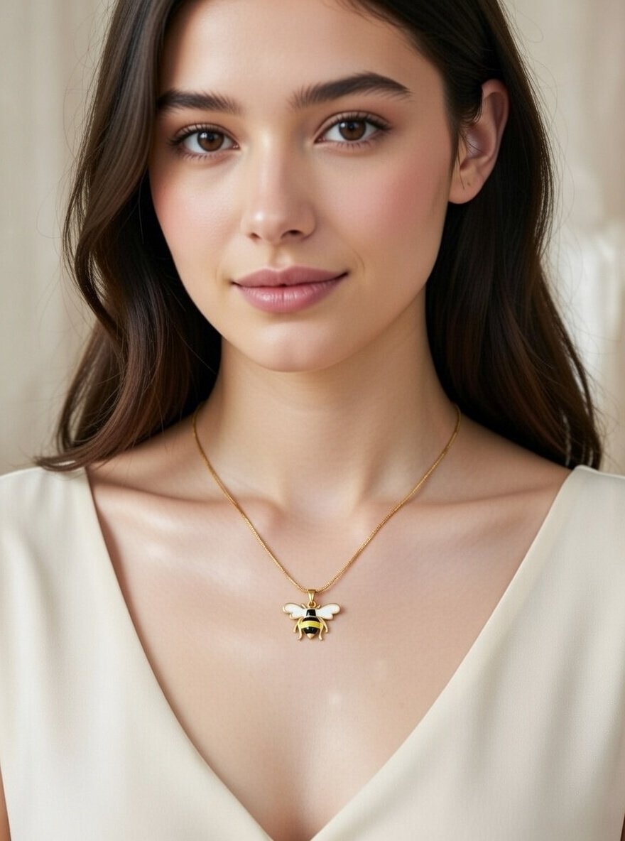 Celebrate the beauty of nature with the BuzzLuxe Bee Pendant Necklace. Featuring a delicately crafted bee with black and yellow enamel stripes, white wings outlined in gold, and polished gold legs and antennae, this pendant captures the spirit of resilience and charm. Suspended from a sleek gold snake chain, it’s a perfect blend of whimsy and sophistication.