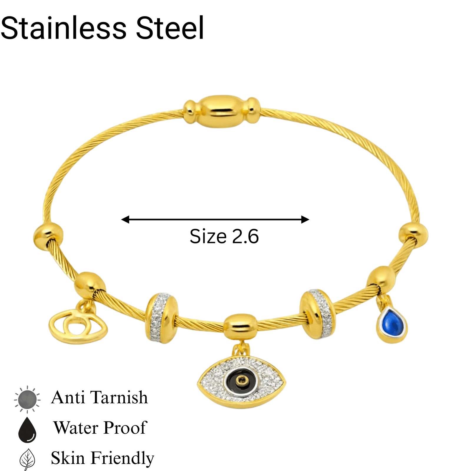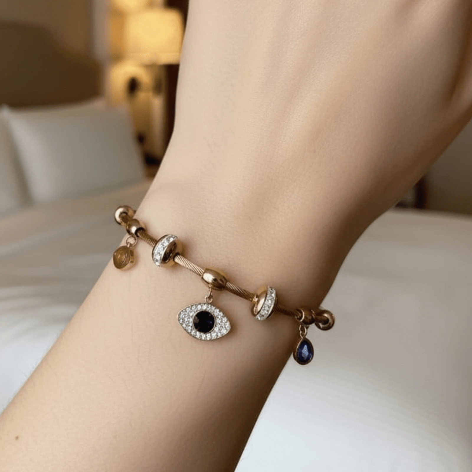 Add a touch of mystique and elegance to your wrist with the DazzleAura Gold Charm Bracelet. Featuring a twisted cable design and a curated set of symbolic charms—including the protective evil eye, sparkling circular beads, and a teardrop blue gem—this bracelet blends spiritual symbolism with modern luxury. Perfect for gifting or daily wear, it’s a statement of style and meaning.