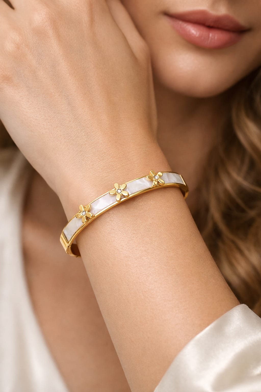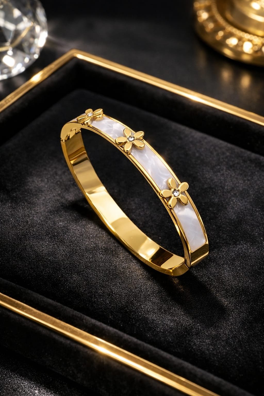 Indulge in timeless elegance with the Ethereal Floral Bloom Kada. This masterpiece is specifically designed for the modern woman who appreciates subtle, high-end luxury. Featuring delicate gold-toned floral motifs set against a shimmering white mother-of-pearl style inlay, this bracelet radiates a sophisticated glow.