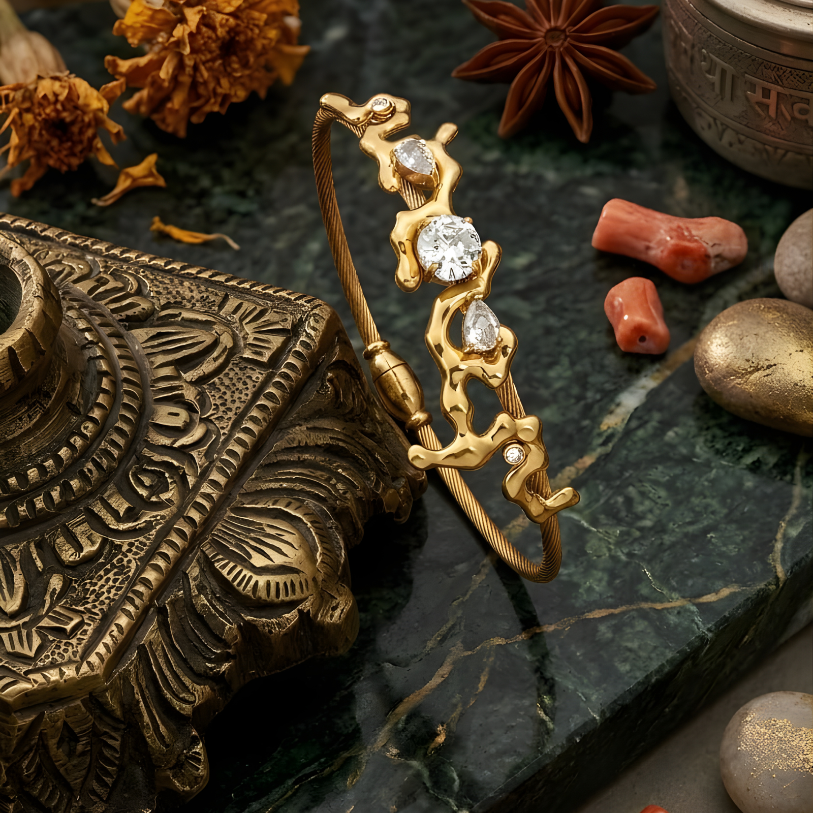 Step into the world of high-fashion artistry with our Abstract Organic Stone Bangle. This avant-garde piece is designed for the woman who views jewelry as wearable art. Featuring a fluid, molten-gold aesthetic inspired by organic natural forms, this bangle balances raw architectural energy with the refined sparkle of premium crystals.