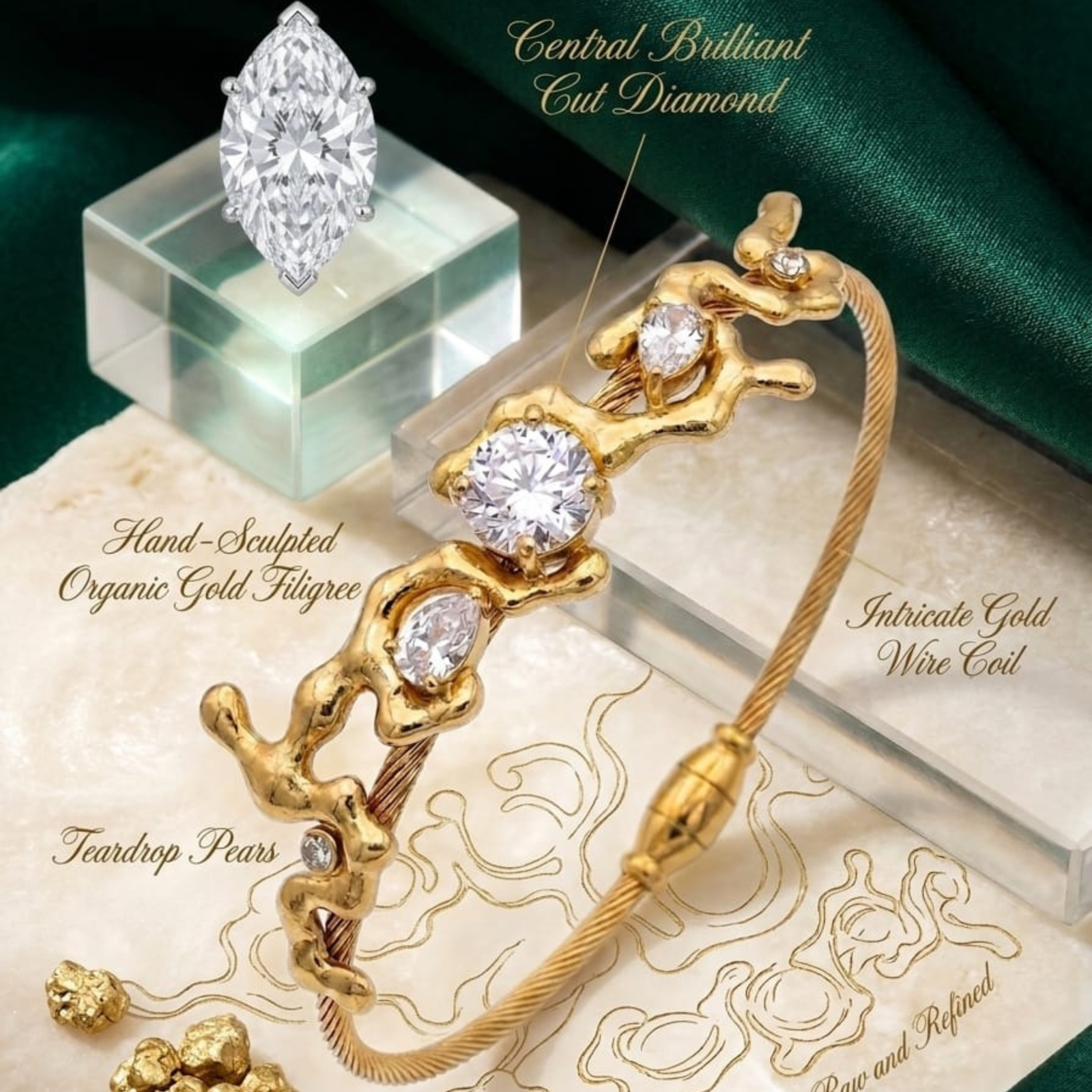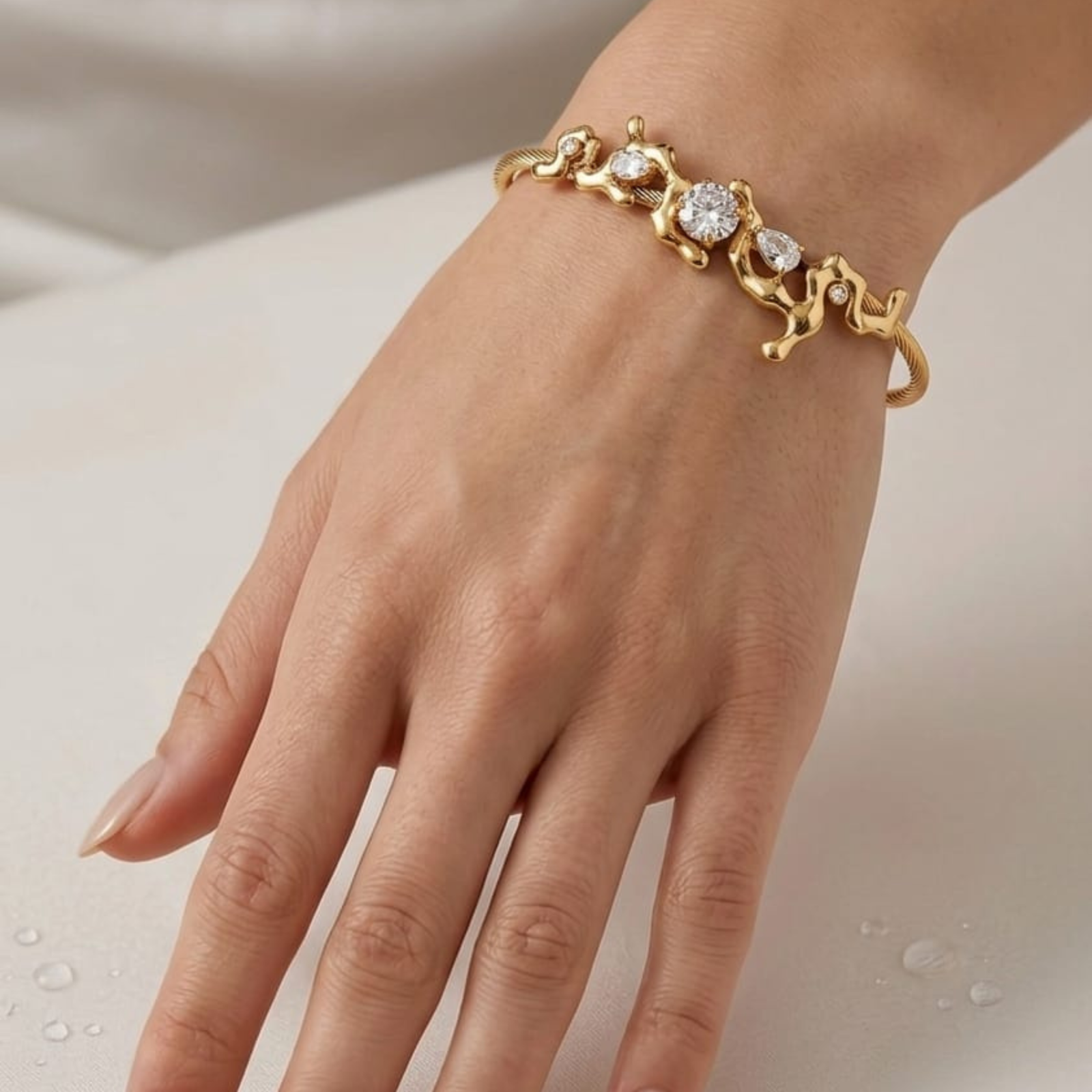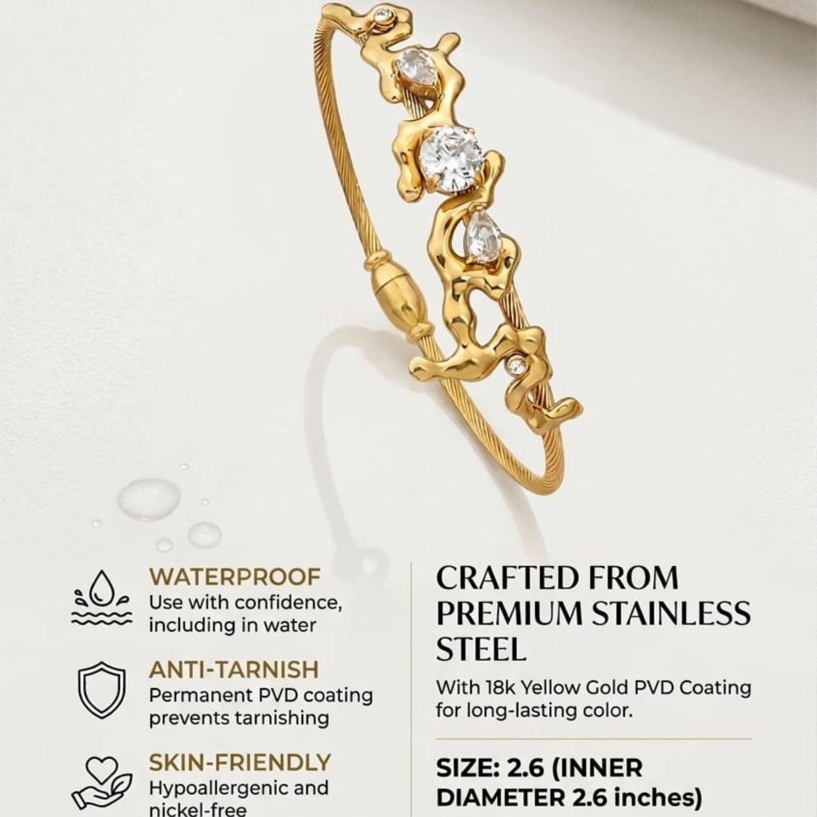 The highlight of this bangle is its striking Molten Gold Frame, which features an irregular, abstract texture reminiscent of ocean coral or flowing liquid metal. Embedded within this organic structure is a stunning Multi-Cut Crystal Cluster, including a brilliant round-cut center solitaire and elegant pear-cut accents. This combination of “rough” gold textures and “refined” sparkling stones creates a sophisticated contrast that is truly one-of-a-kind.