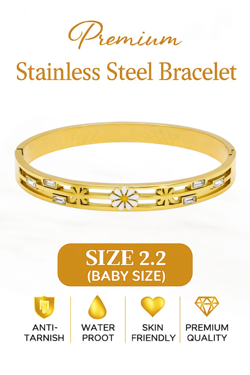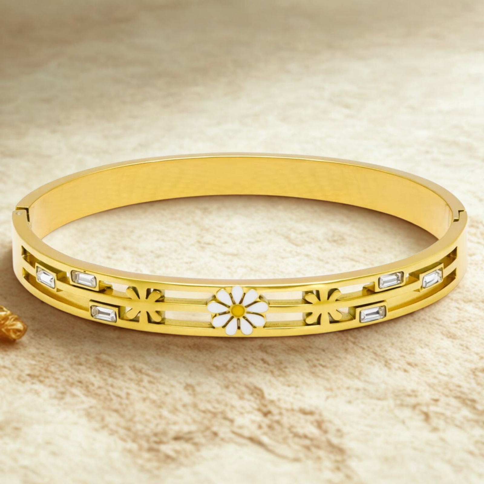Add a touch of elegance to your jewelry collection with this intricately designed gold bangle bracelet featuring a central white and yellow flower motif, flanked by symmetrical floral cutouts and embedded rectangular clear gemstones. The dual-band structure offers a refined, structured look, while the polished gold-tone finish ensures lasting shine. Perfect for festive occasions, weddings, or heartfelt gifting, this bracelet blends nature-inspired charm with timeless sophistication.