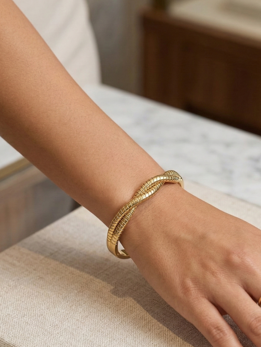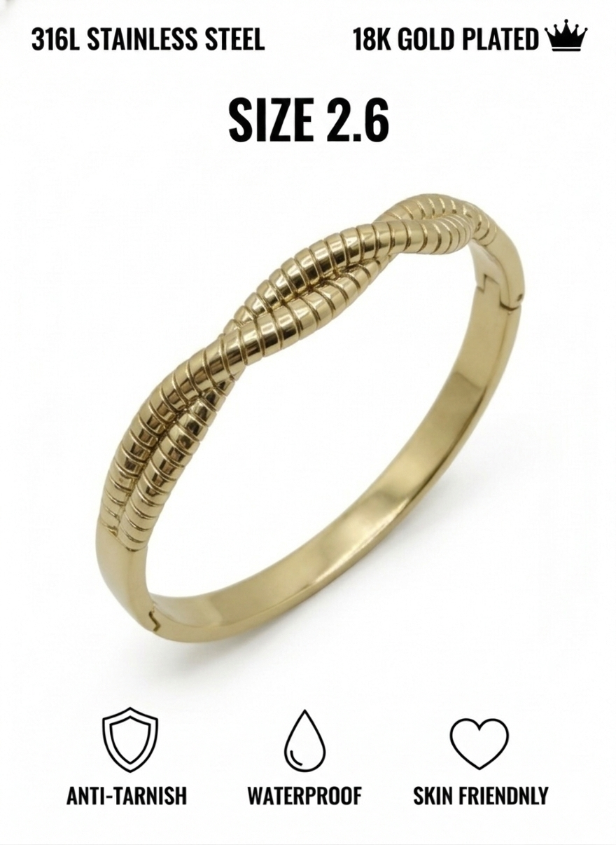 We believe that beauty should last. That is why this Gold Braided Twist Bangle is made from high-grade 316L Stainless Steel. To ensure a luxurious and long-lasting shine, we use advanced 18K Gold Plating techniques. This ensures your bangle remains as radiant as the day you bought it, even with regular use.