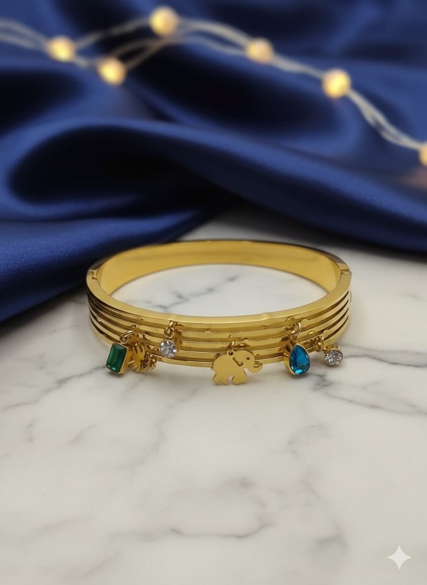 Make a statement with this bold gold bangle bracelet featuring a grooved texture and a vibrant lineup of hanging charms. From the regal tiger to the playful elephant, each charm adds personality and flair. Accented with green, blue, and clear gemstones, this bracelet blends symbolism with sparkle—perfect for festive wear, gifting, or everyday glam.