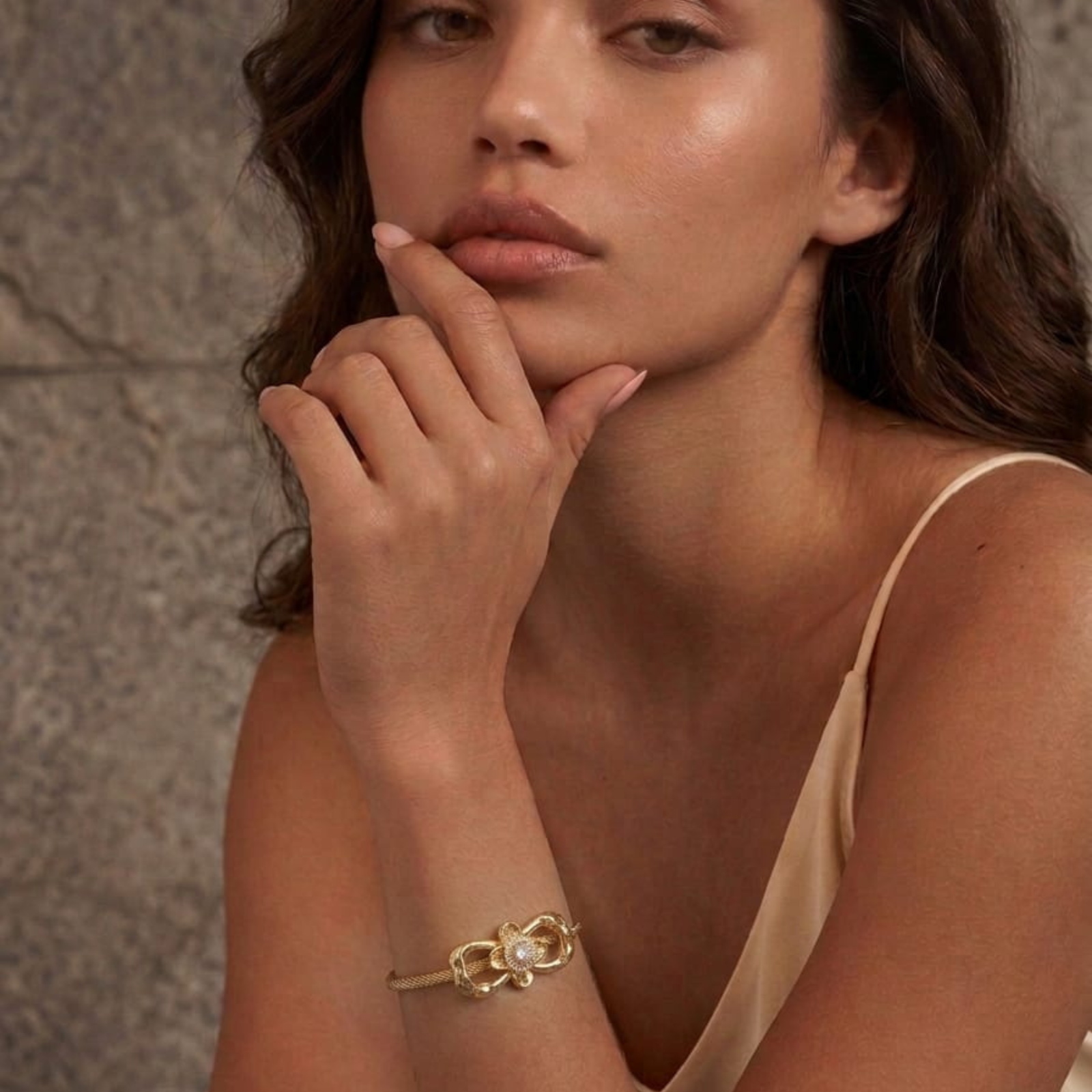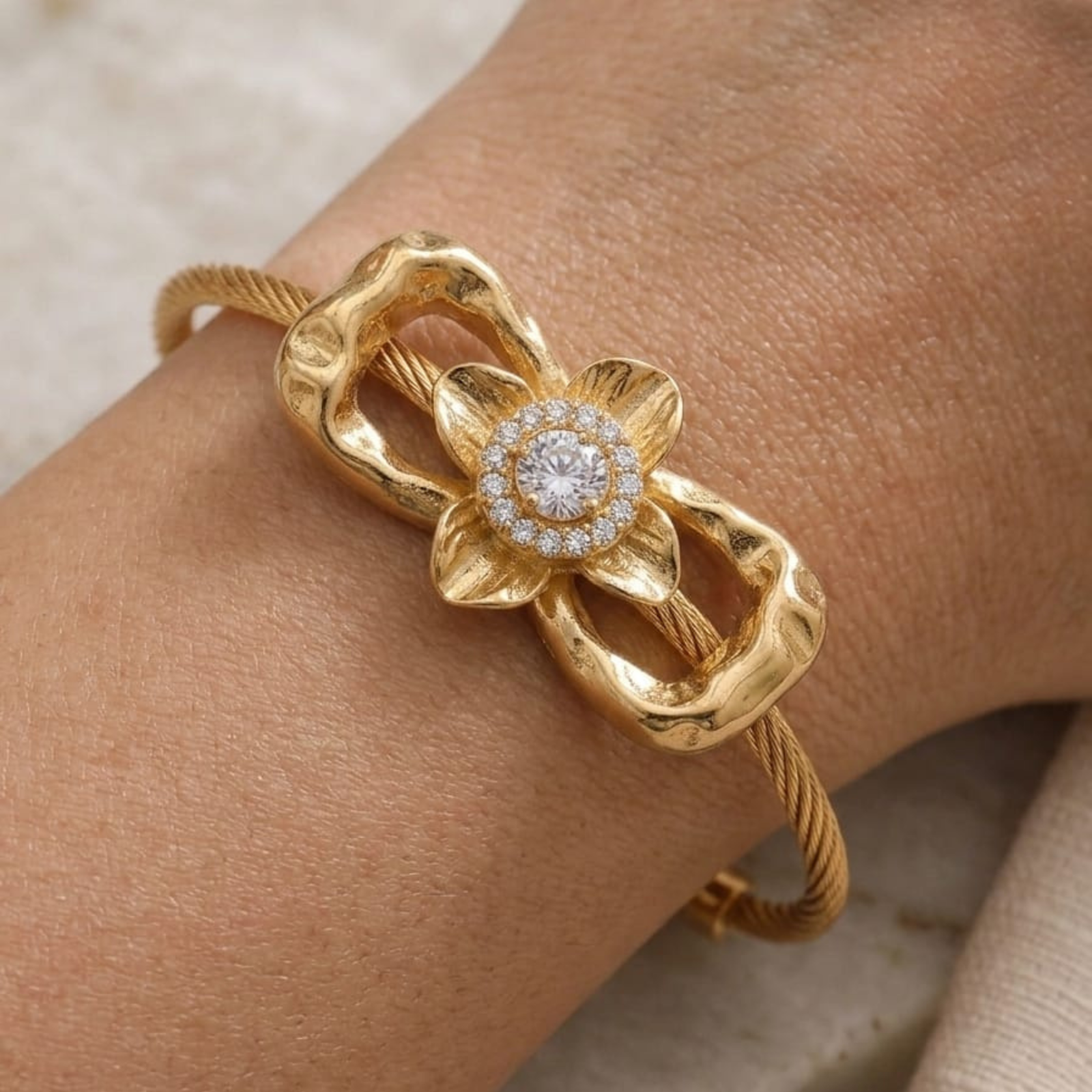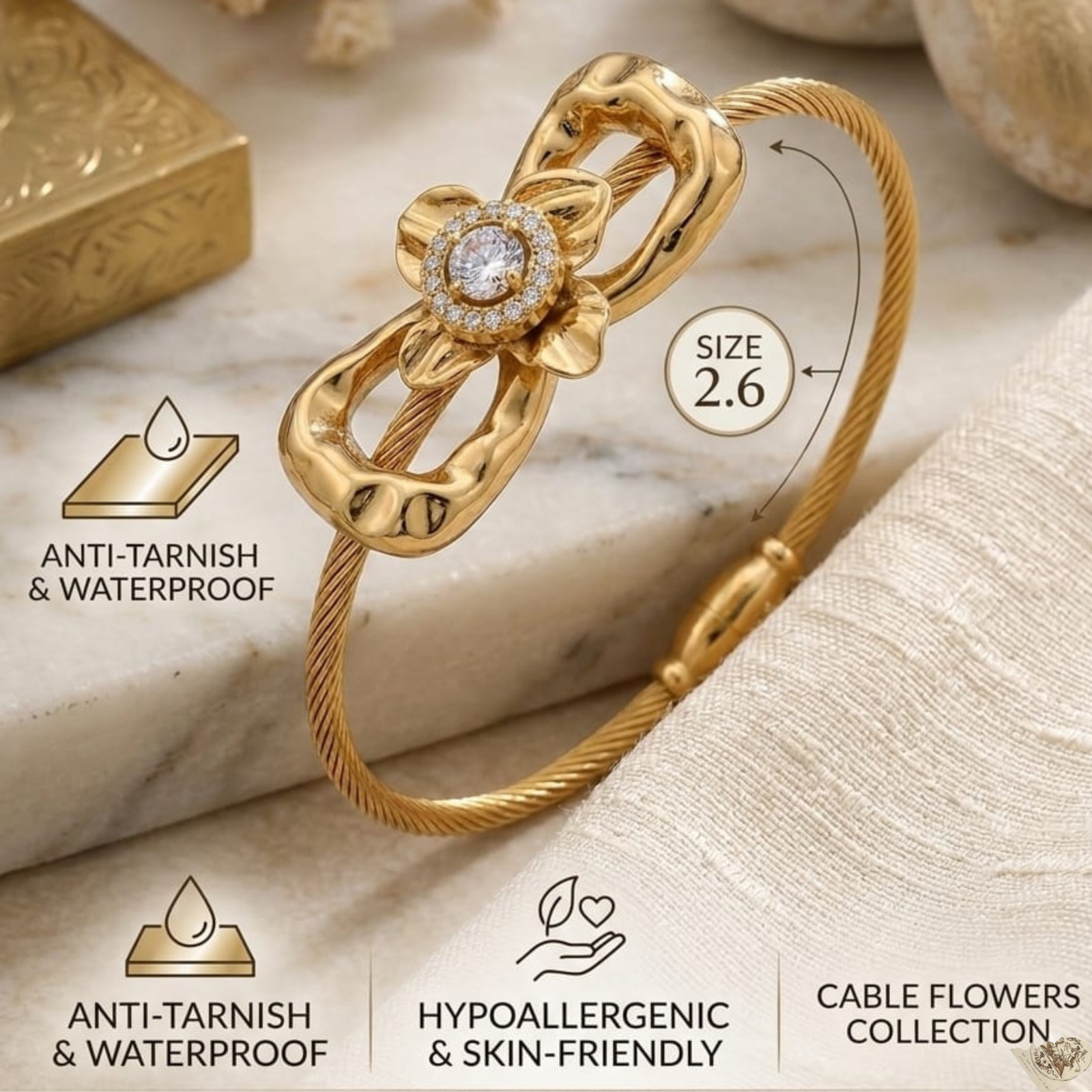Make a sophisticated statement with our Flower Bow Cable Bangle, an architectural masterpiece that combines industrial-chic textures with delicate floral aesthetics. This bangle is designed for the woman who appreciates bold, sculptural jewelry that stands out from the crowd. Featuring a unique bow-inspired frame and a radiant center bloom, it is the ultimate accessory for adding luxury to your wrist.