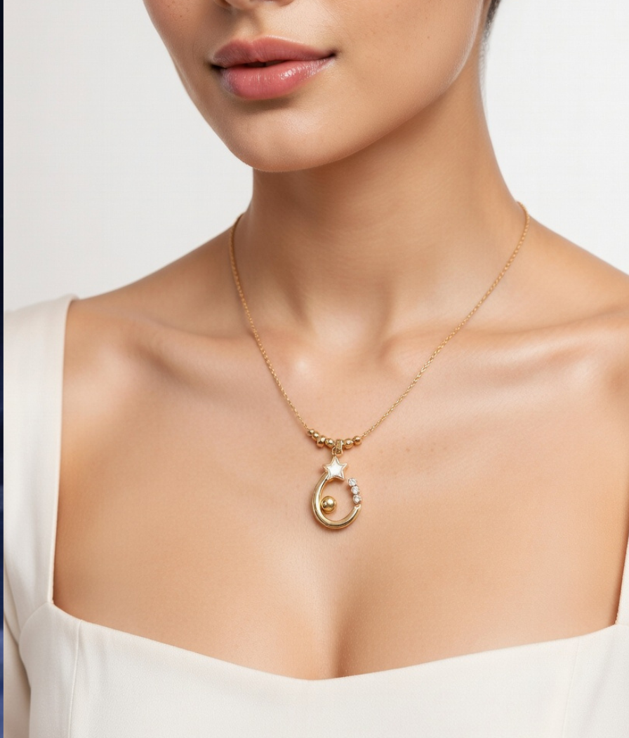 - Pendant Design: Celestial Swirl with Mother-of-Pearl Star, Crystal Accents & Gold Ball