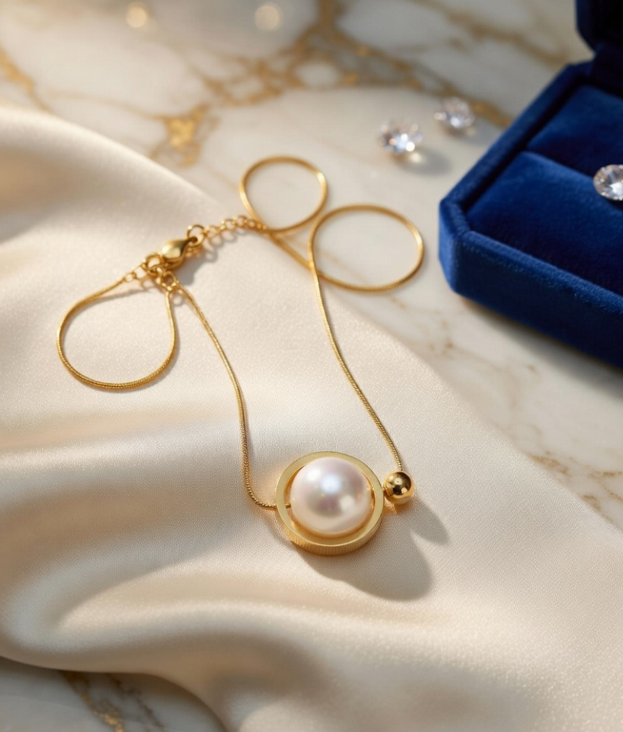 - Pendant Design: Circular Frame with Floating Pearl + Gold Ball Accent