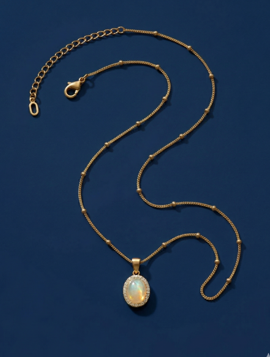 Exquisite Craftsmanship Every detail of this necklace has been meticulously crafted to ensure premium quality. The chain is a sophisticated beaded snake style, offering a textured look that feels smooth against the skin. The pendant is encased in a halo of brilliant micro-pave crystals that add a touch of sparkle without overpowering the natural glow of the central stone. The 18K gold plating provides a rich, deep luster that mimics solid gold at an accessible price point.