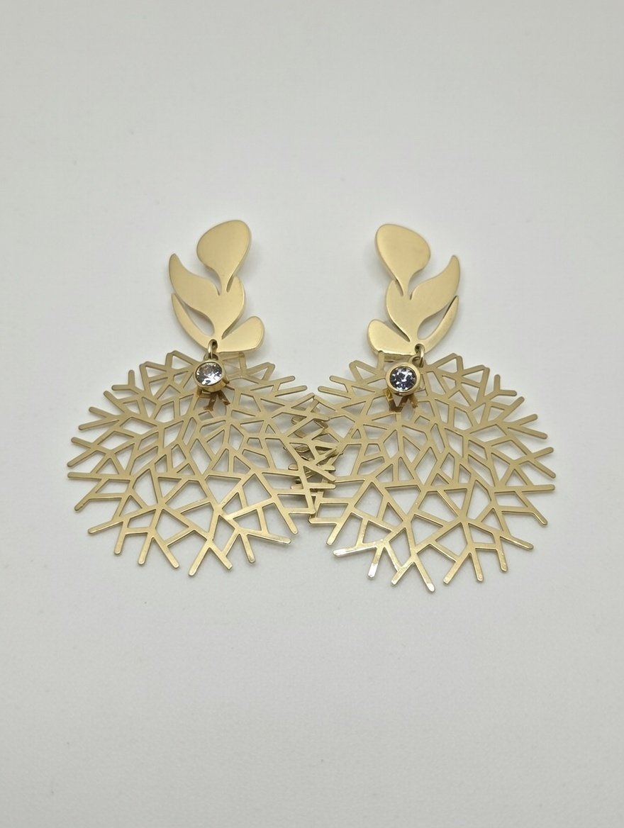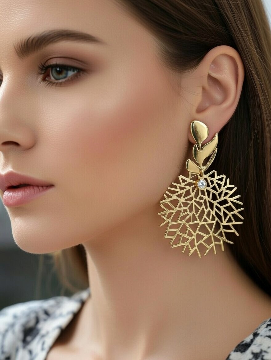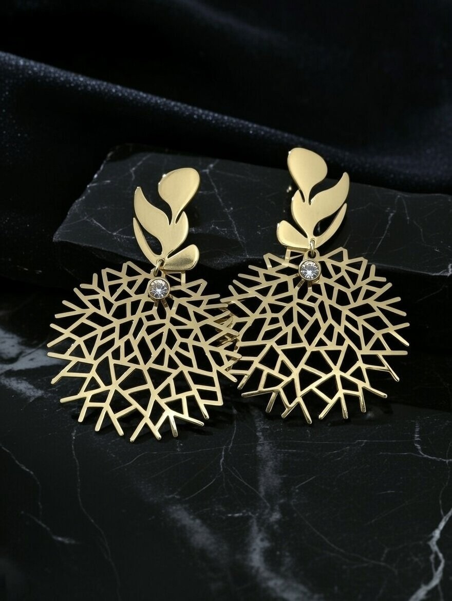 Add a touch of artistic flair to your jewelry collection with our Golden Lattice Leaf Drops. These earrings are a true testament to fine craftsmanship, featuring a stunning dual-part design. The top is a polished golden leaf motif, which elegantly suspends a large, circular lattice “web” disc. The intricate open-work design creates a light and airy feel, while the high-shine gold finish ensures a luxurious presence that captures the light from every angle.