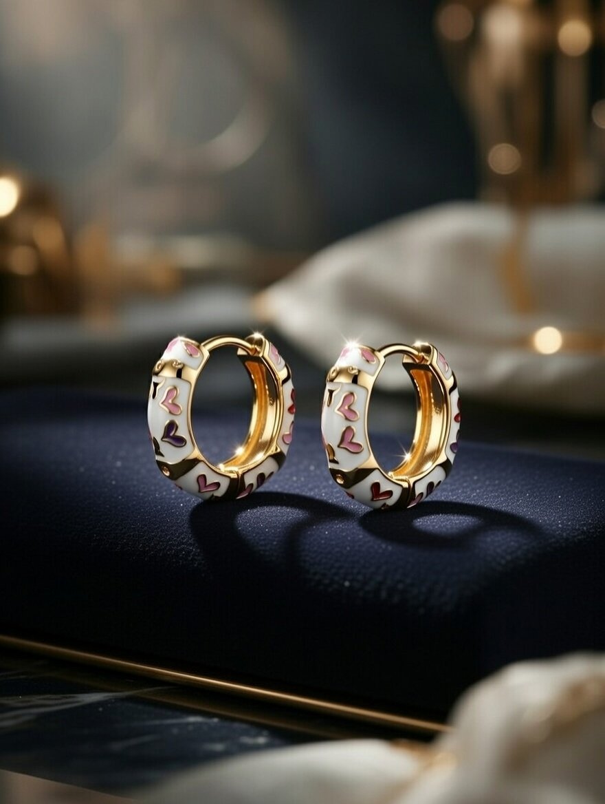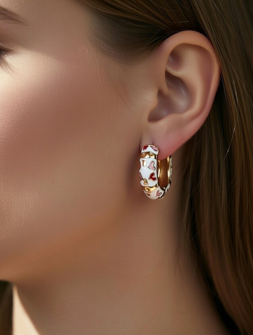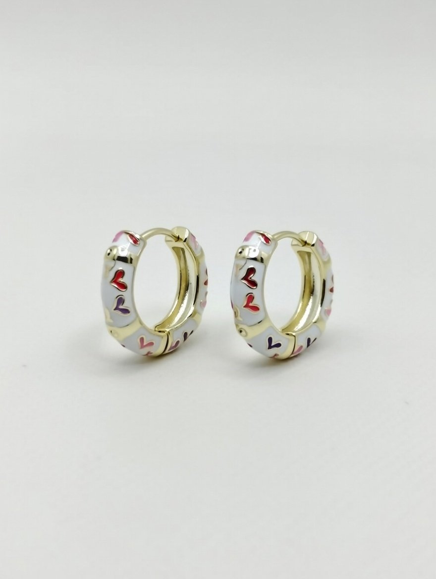 These mini hoops feature a glossy gold finish with cute multicolor heart enamel detailing, making them perfect for casual outings, college wear, or special occasions.