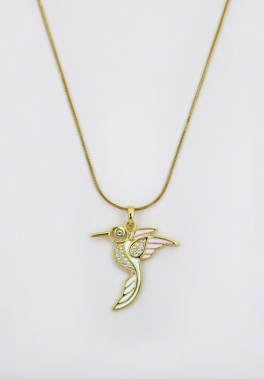 Bring a touch of nature’s beauty to your style with our Hummingbird Enamel Pendant. This piece is a work of art. It features a graceful hummingbird in flight. The wings are decorated with soft pink and white enamel. Moreover, the body is encrusted with sparkling Cubic Zirconia stones. This combination creates a look that is both playful and luxurious.