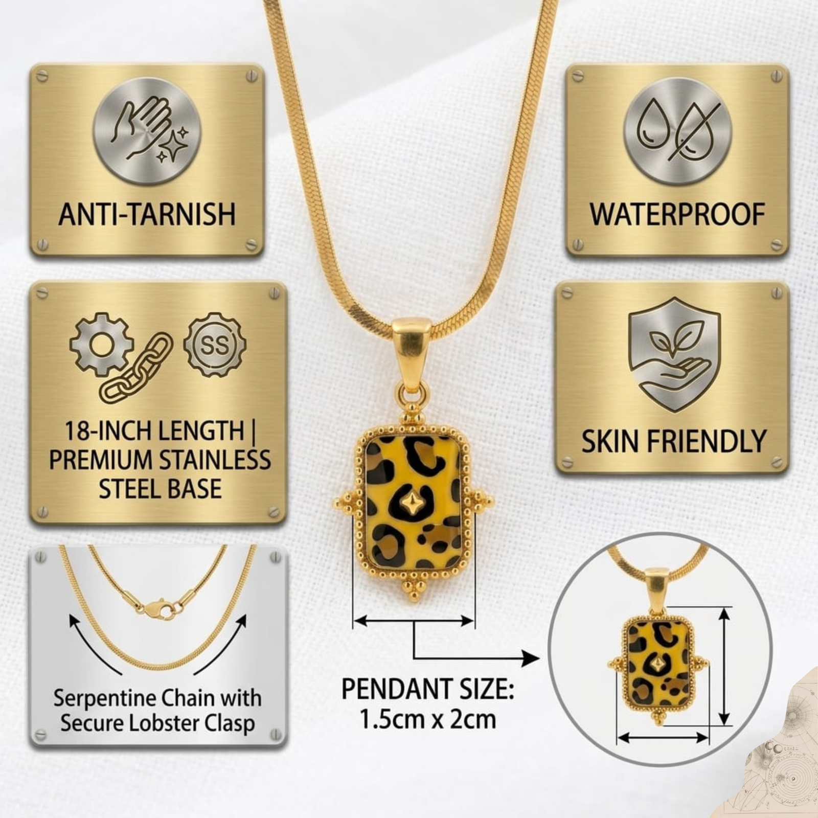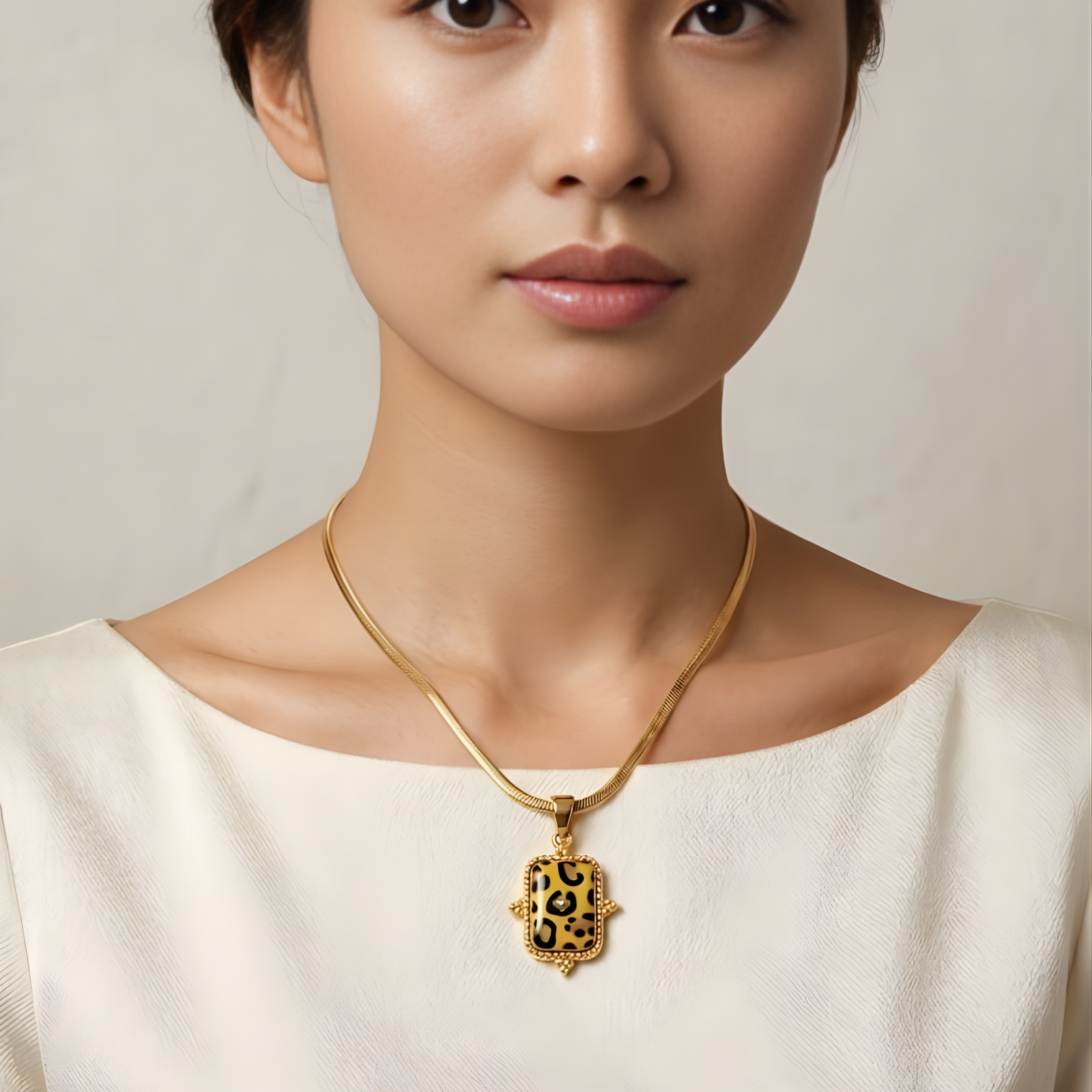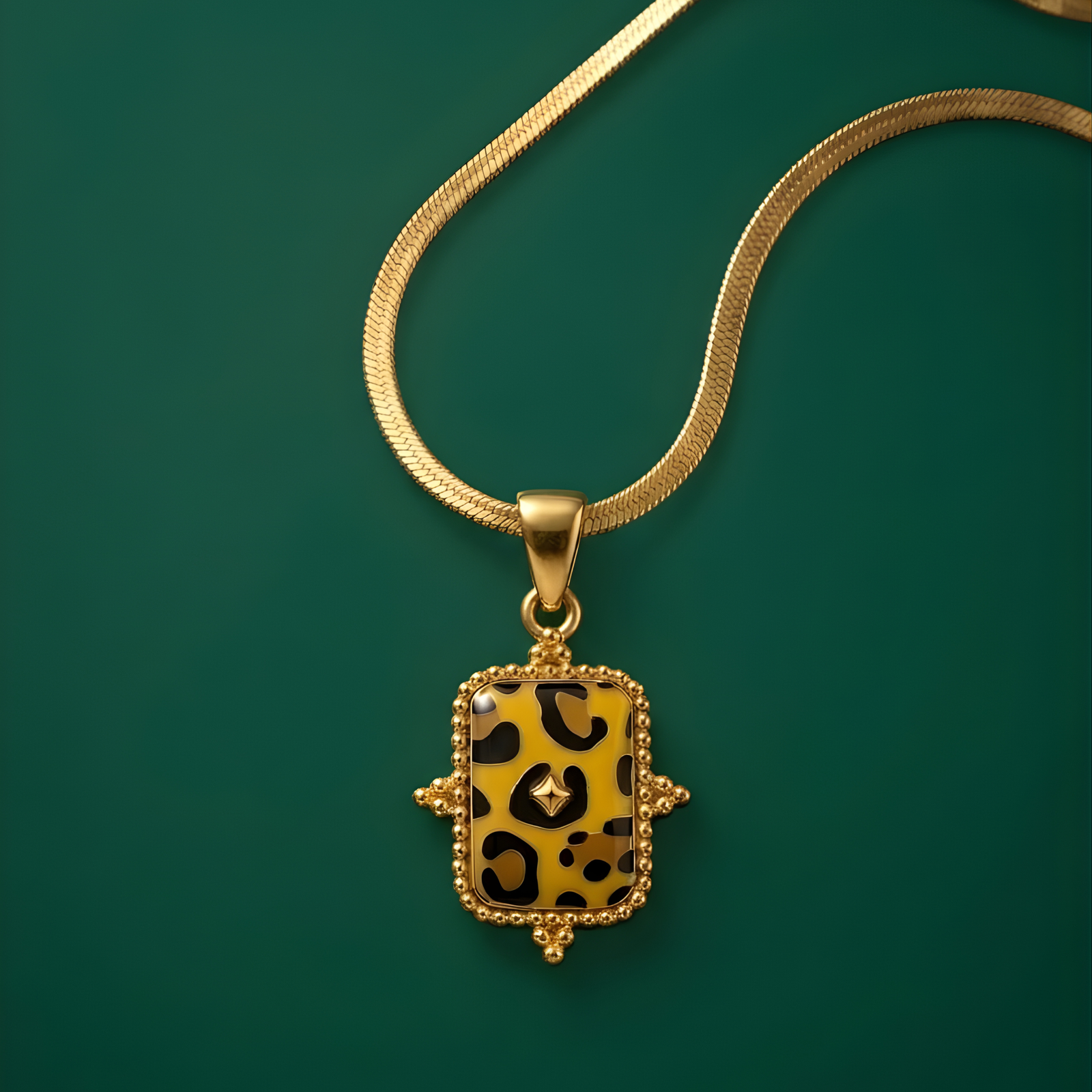 The centerpiece of this necklace is a vibrant Leopard Animal Print encased in a sleek, rectangular gold frame. To add a touch of artisanal detail, the frame is adorned with intricate beaded granulation, giving the pendant a high-end, handcrafted appearance. It hangs elegantly from a Flat Herringbone Chain (also known as a blade chain), which lies flat against the skin to provide a liquid-gold shimmer with every movement.