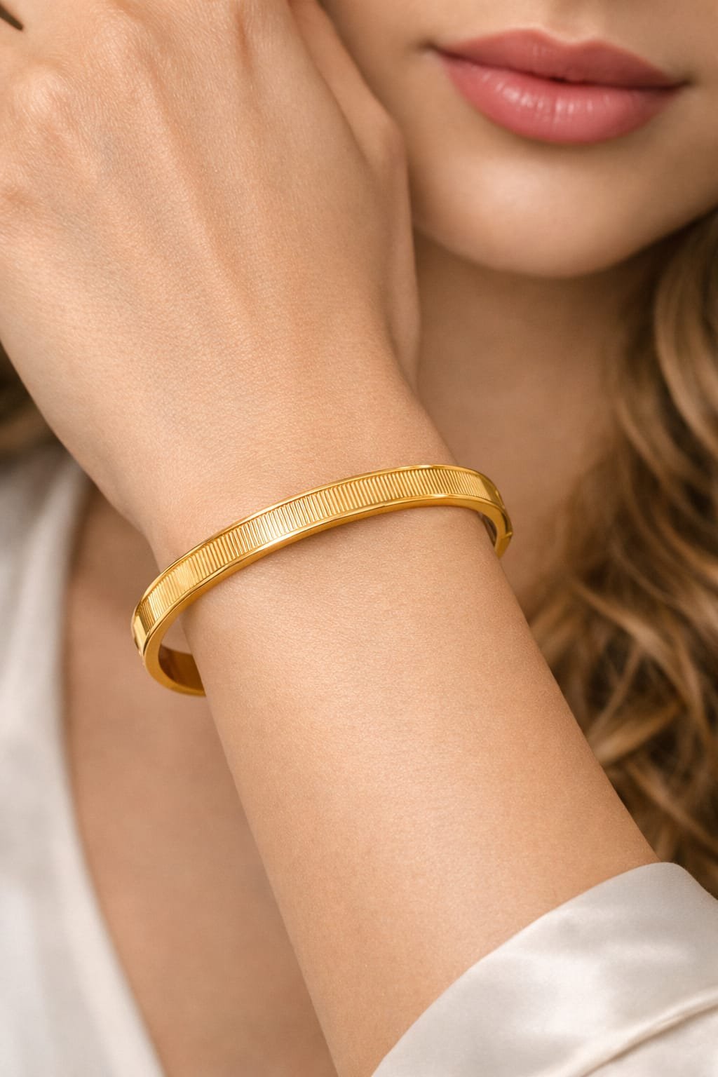 The Linear Luxe Textured 18K Gold Plated Kada is the ultimate statement of minimalist luxury for the modern woman. This premium bracelet features a unique vertical ridge pattern that adds a sophisticated texture and a high-fashion edge to your look. Specifically crafted in Size 2.6, it provides a comfortable and secure fit for the standard Indian wrist.