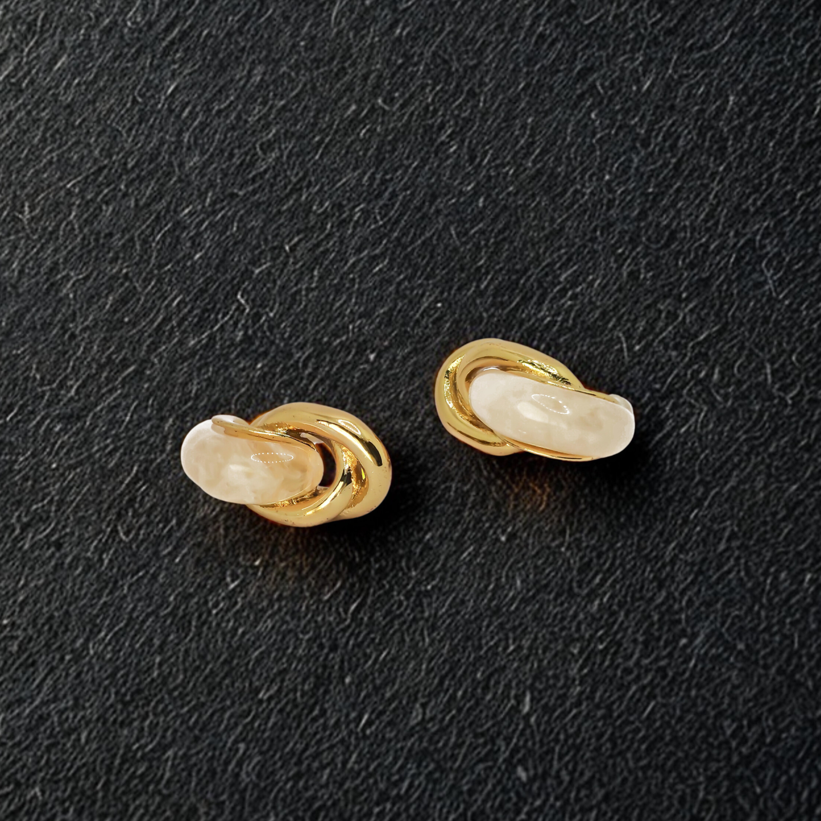 Where elegance meets edge—Luna Embrace earrings fuse molten gold curves with soft cream-toned resin, sculpted to cradle the ear in a dance of contrast and harmony. Inspired by lunar crescents and modern architecture, each piece wraps the lobe in a warm glow, making it the perfect statement for both daywear and evening allure.