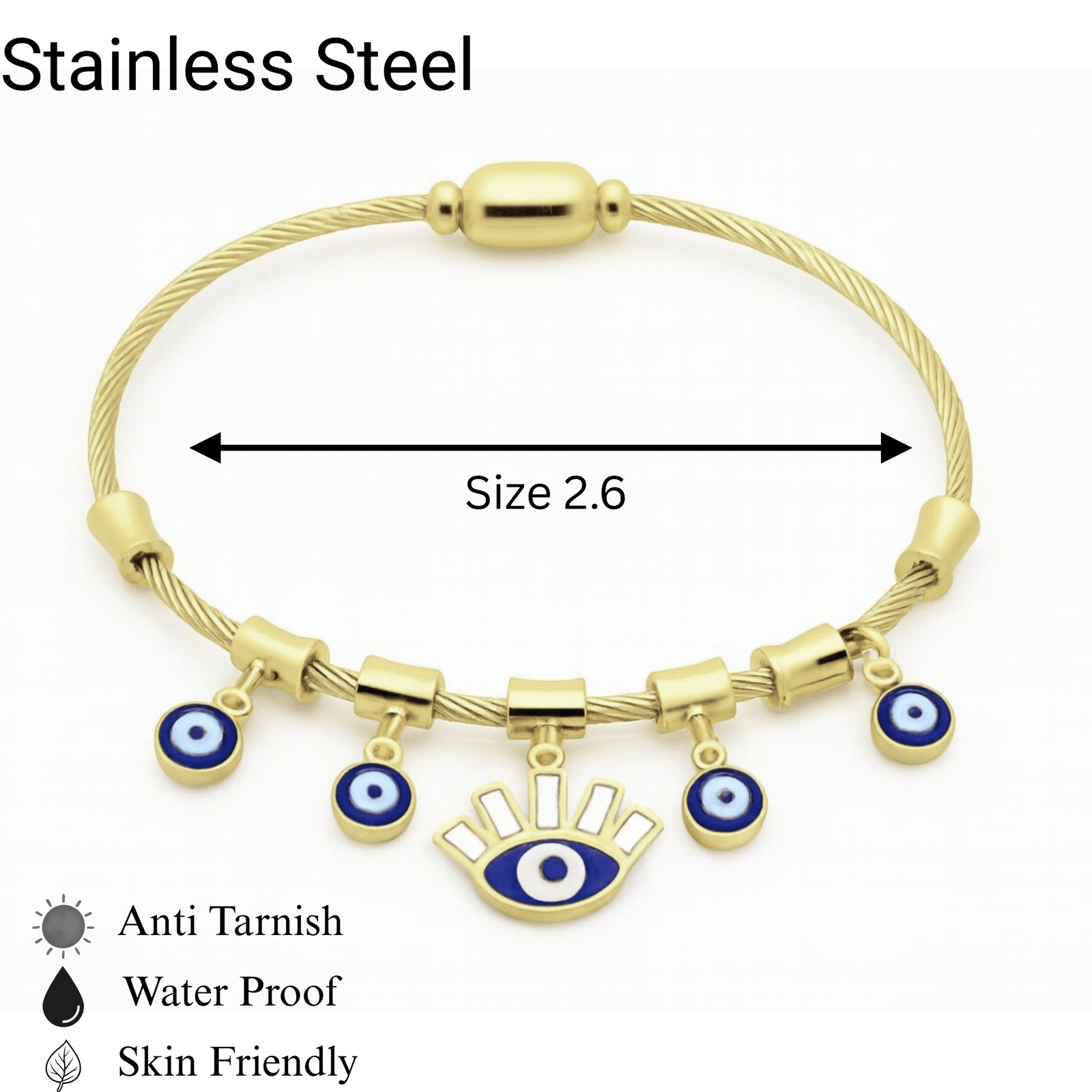 Ward off negativity in style with Mystic Shield, a gold cable bracelet that blends cultural symbolism with modern elegance. Featuring a twisted cable design and a secure magnetic clasp, this piece is adorned with five evil eye charms—four petite protectors and one bold centerpiece with stylized lashes. Each charm showcases the iconic blue-and-white motif, believed to guard against ill will and attract positive energy. Whether worn solo or stacked, it’s a statement of strength and style.