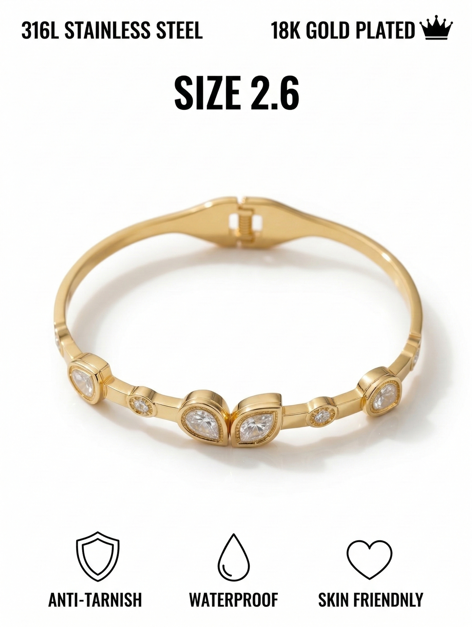 We understand that your jewelry should last. That is why this Pear Drop Gold Bracelet is crafted from premium-grade 316L Stainless Steel, known for its incredible strength and resistance to corrosion. To give it that authentic, rich glow, we apply a thick layer of 18K Gold Plating using advanced PVD coating technology. This ensures that your Pear Drop Gold Bracelet maintains its brilliant shine without fading over time.