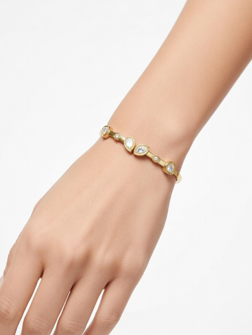 The highlight of this Pear Drop Gold Bracelet is its unique arrangement of sparkling pear-shaped stones. Each stone is carefully set into a high-quality 316L Stainless Steel band to ensure it catches the light from every angle. The sleek, minimalist design makes it versatile enough to be worn alone for a clean look or stacked with other favorite pieces from justjewel.co.in.