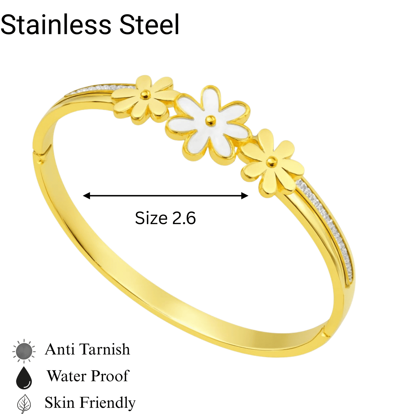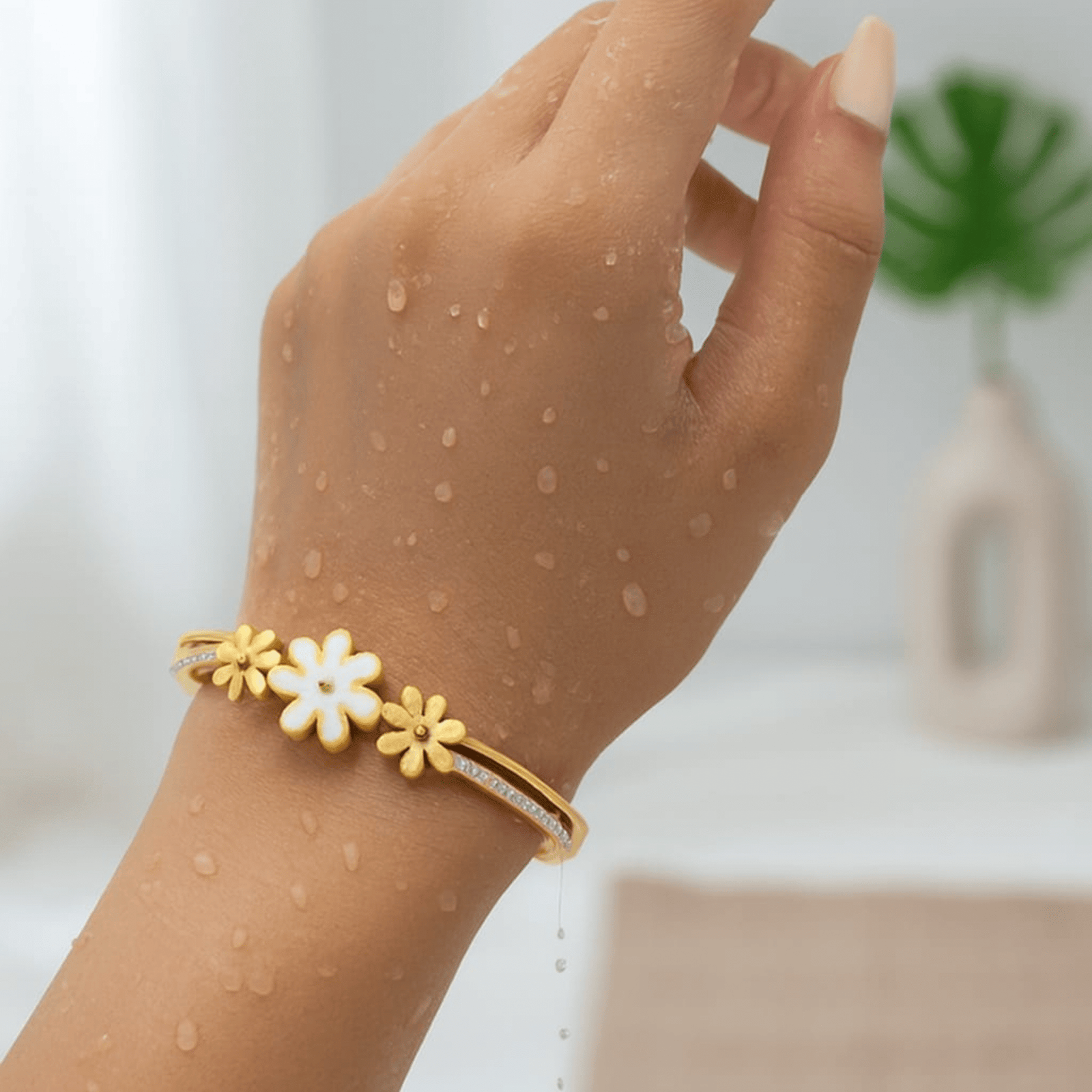 Delicate as a bloom, radiant as a memory—Petal Grace is a celebration of floral finesse. This gold bracelet features a trio of blossoms, with a luminous white enamel centerpiece flanked by two golden floral accents. A shimmering row of diamonds curves along the band, adding sparkle to its graceful silhouette. Whether worn at a celebration or gifted with love, this piece whispers elegance in every petal.
