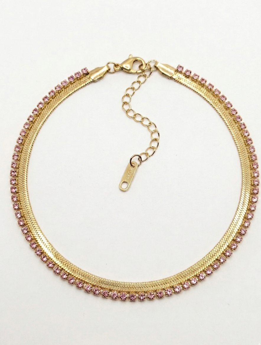 Elevate your jewelry collection with our Anti Tarnish Pink Stone Bracelet. This unique design features a classic, high-polish flat herringbone snake chain paired with a vibrant row of shimmering pink cubic zirconia crystals. The contrast between the bold, fluid gold chain and the delicate pop of pink creates a sophisticated accessory that captures the light and commands attention. It is the perfect piece for those who love a mix of modern “clean girl” aesthetics and glamorous sparkle.