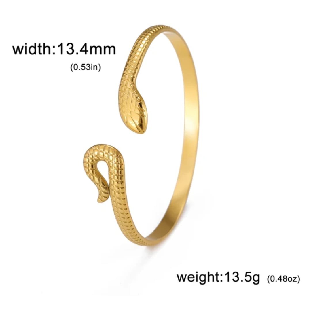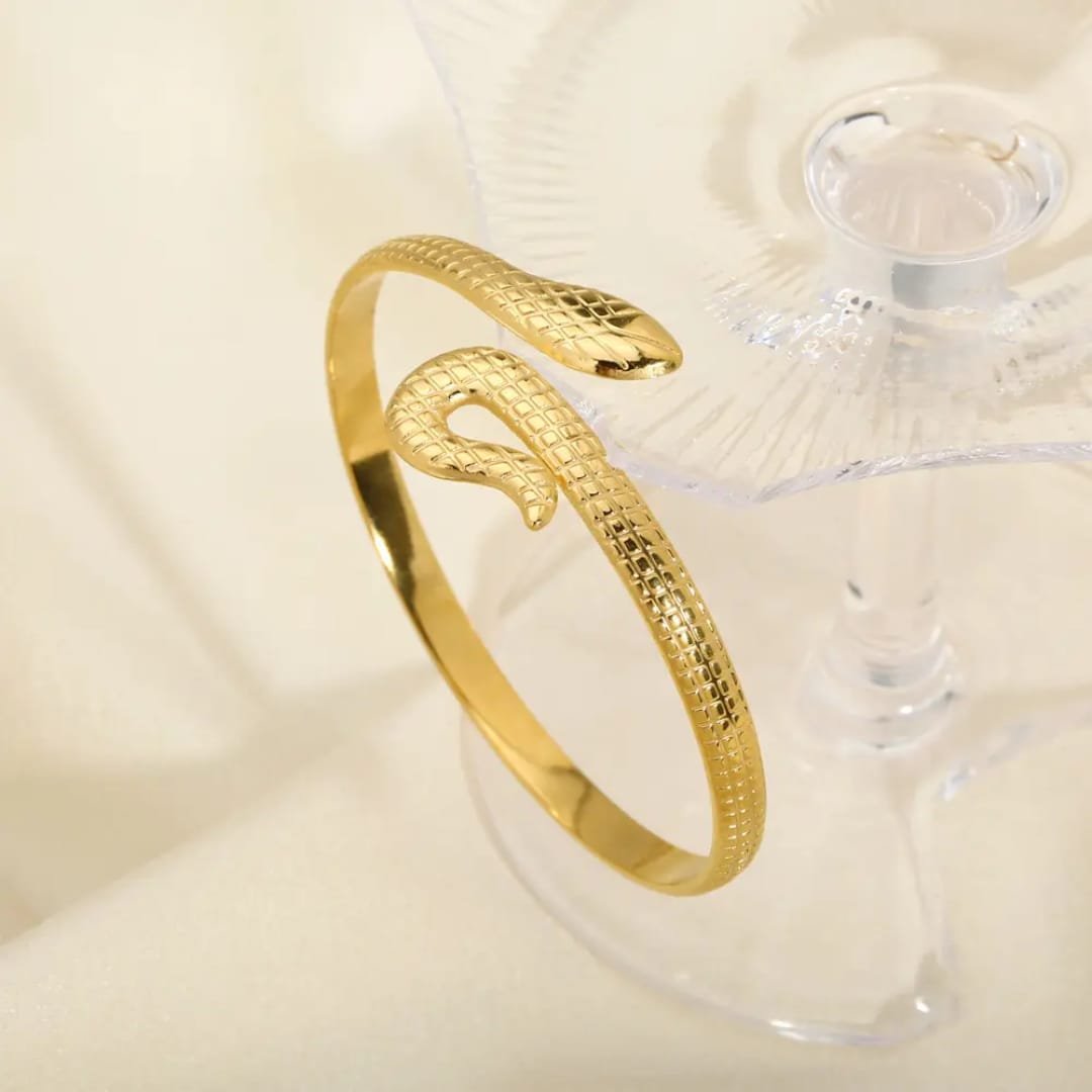 Unleash the mystique of transformation with Serpent Embrace, a striking gold bangle sculpted in the form of a coiled snake. Its lifelike texture mimics delicate scales, while the raised head and curved tail evoke motion and power. Symbolizing rebirth and protection, this bracelet wraps your wrist in timeless elegance and bold symbolism. Whether worn solo or stacked, it’s a statement of strength, style, and story.