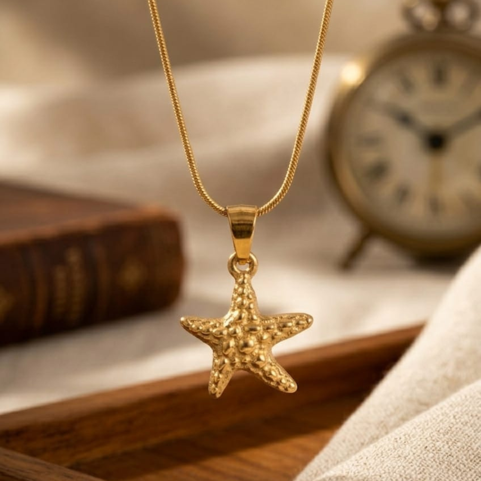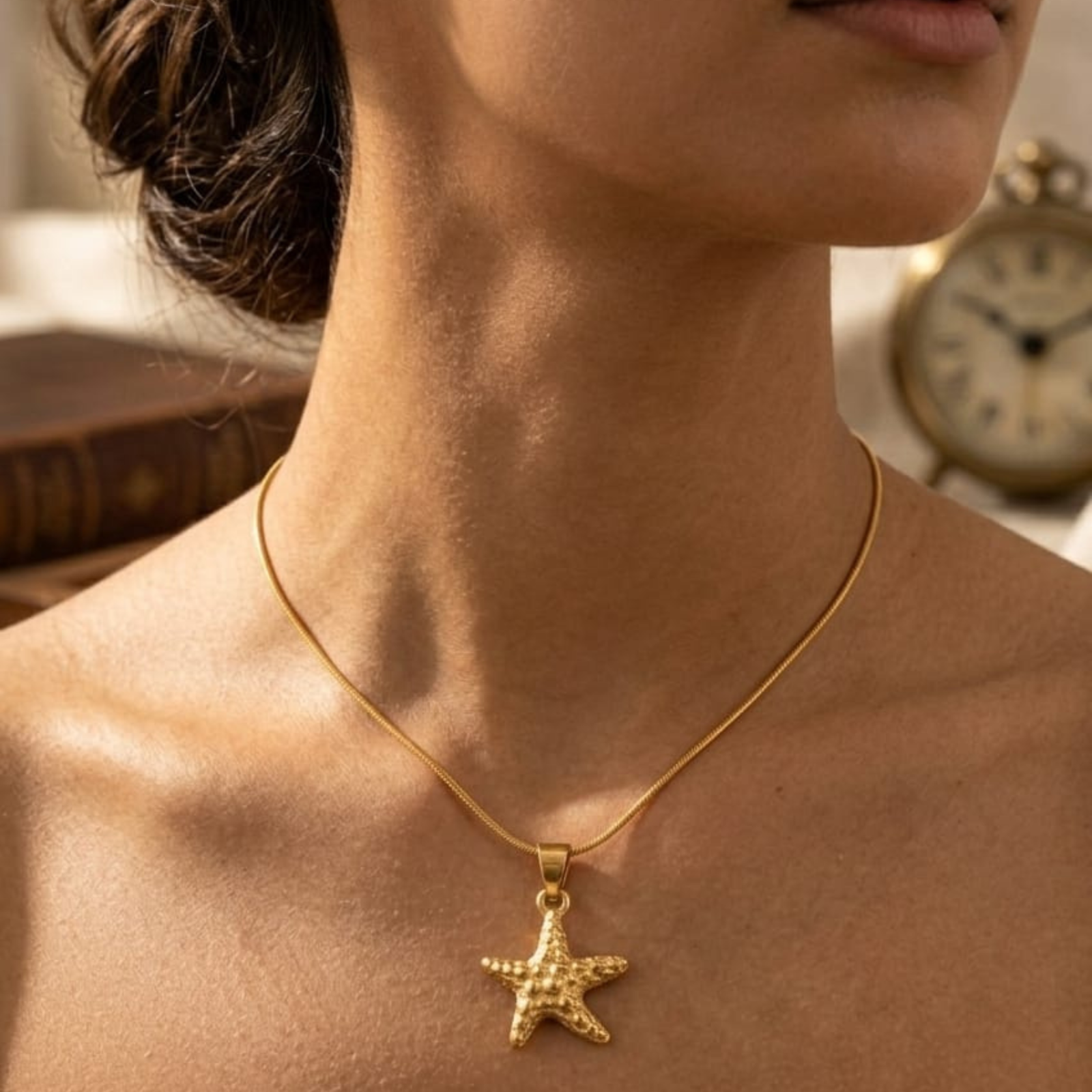 The highlight of this necklace is the Textured Starfish Pendant, featuring a realistic, organic surface. The pendant is crafted with minute beaded detailing to mimic the natural texture of a real starfish, giving it a 3D effect that catches the light beautifully. To complement the detailed pendant, we’ve paired it with a high-shine Snake Chain, providing a smooth, liquid-gold finish that feels incredible against the skin.