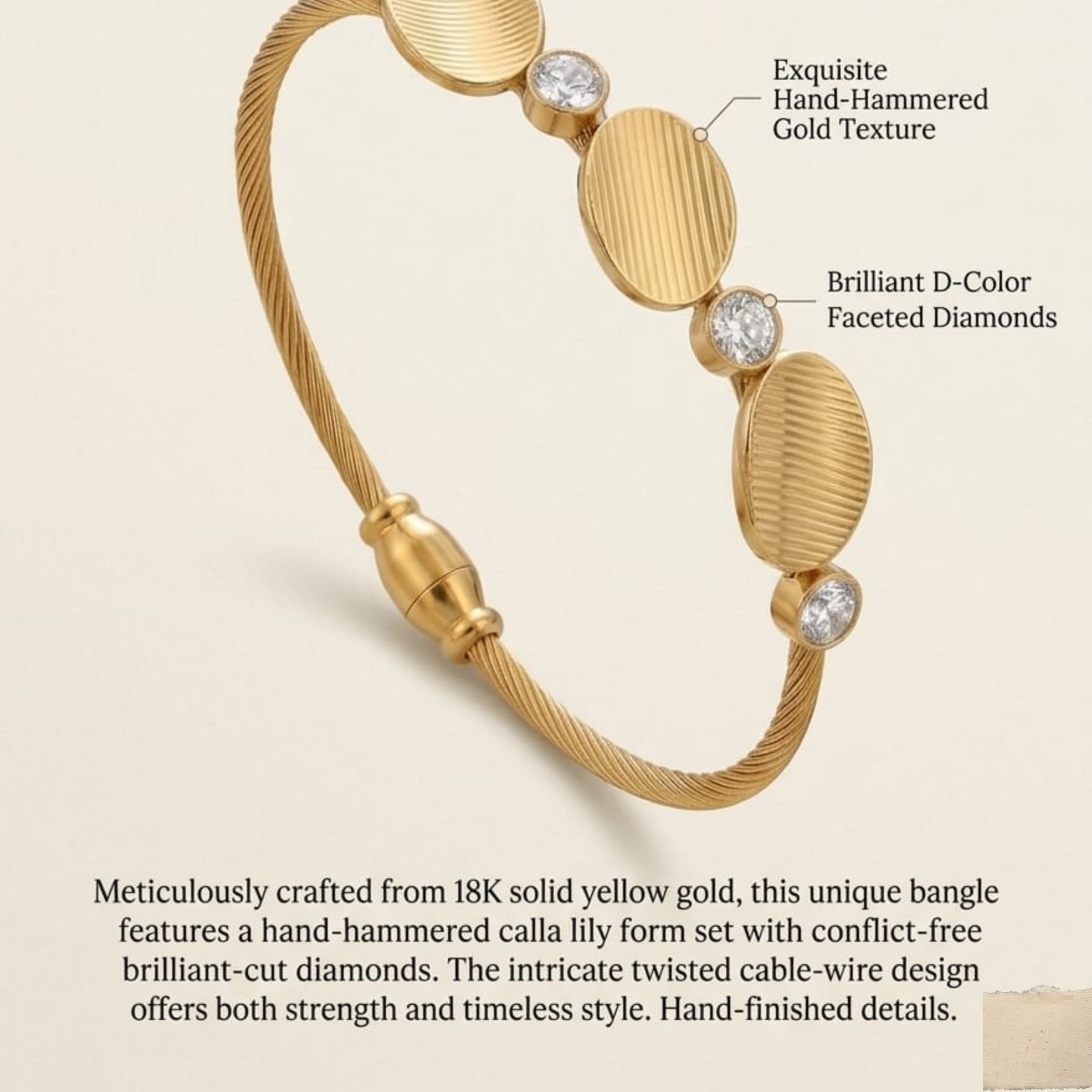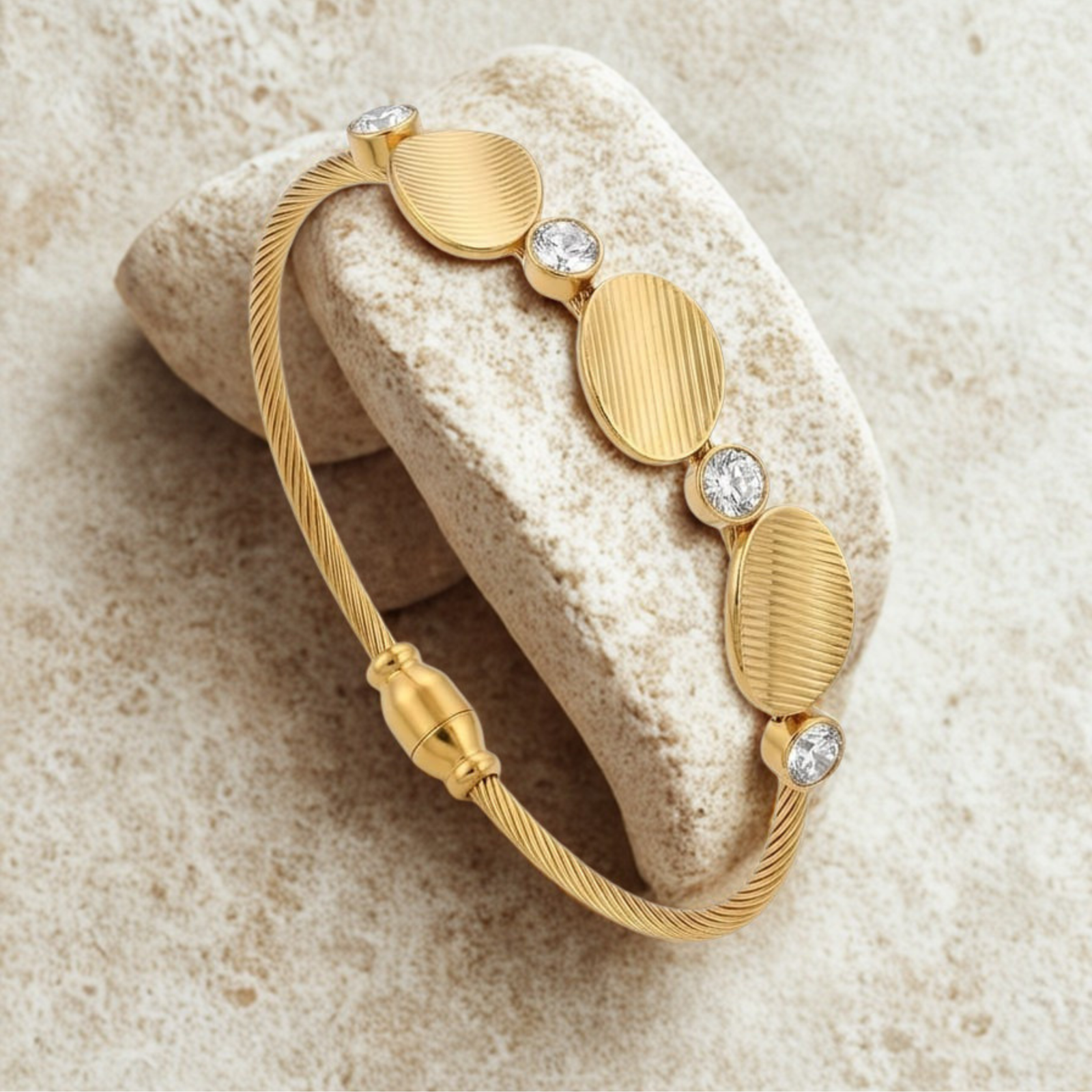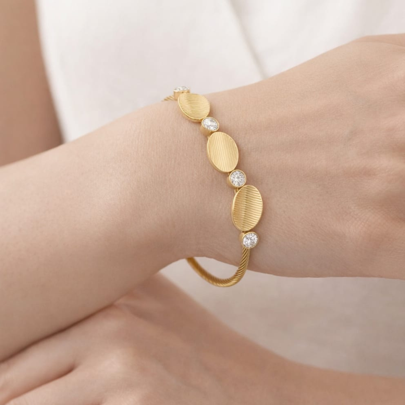 The centerpiece of this bangle features three Textured Oval Discs beautifully arranged across the top. Each disc is finished with a unique linear “brushed” texture that catches the light in a subtle, matte-to-gloss shimmer. Interspersed between these discs are four brilliant Round-Cut Cubic Zirconia crystals, each securely held in a polished bezel setting. This alternating pattern of golden texture and radiant sparkle creates a balanced, rhythmic look that is both bold and refined.