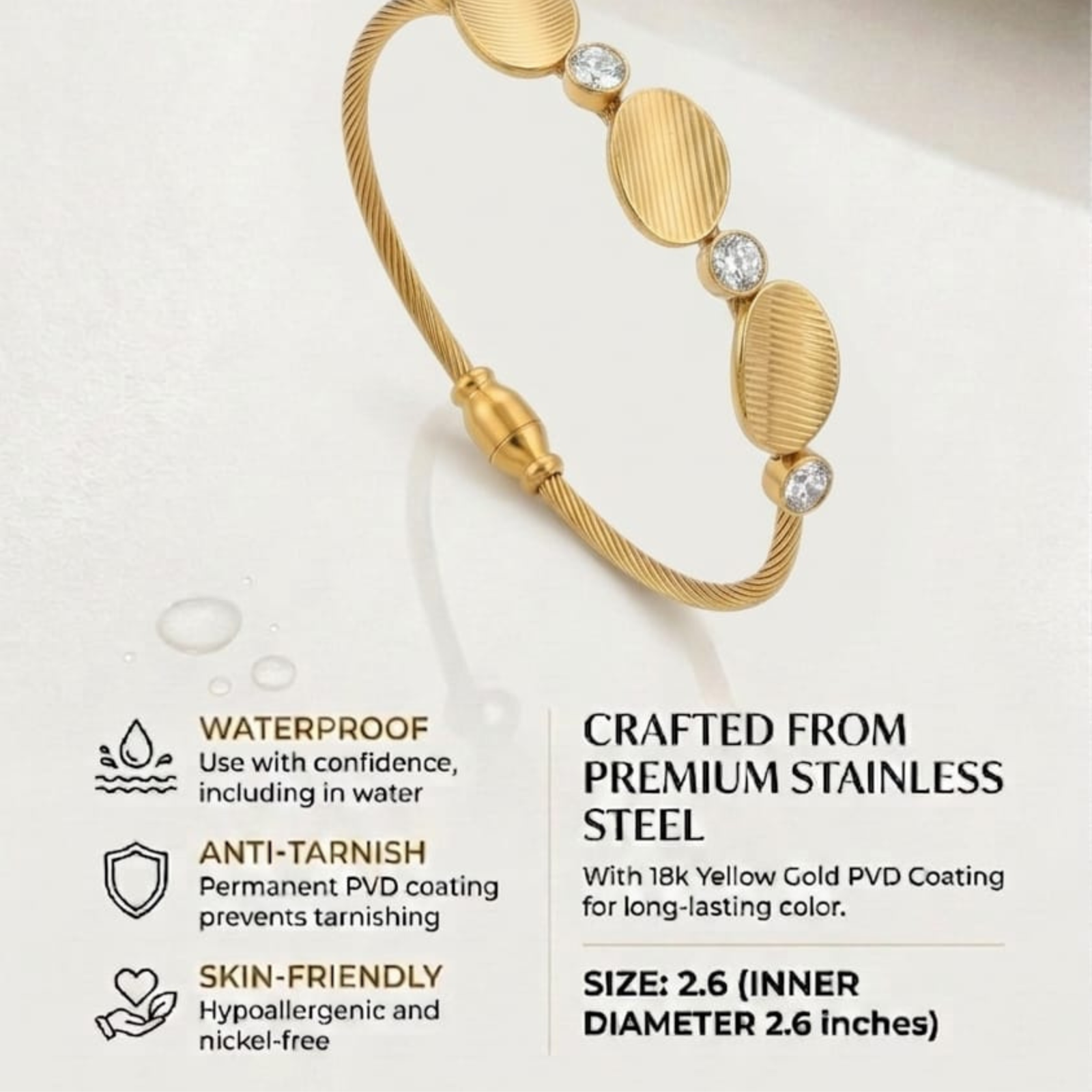 100% Waterproof & Anti-Tarnish: This bangle is 100% life-proof. Whether you’re in the shower, at the gym, or caught in the rain, it is guaranteed not to tarnish, rust, or turn your skin green.