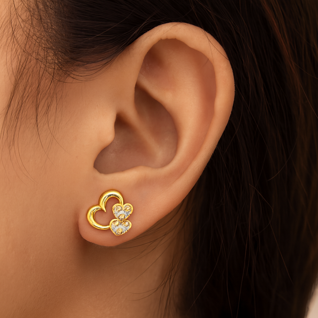 Celebrate love in its purest form with Twinned Hearts, a pair of gold-tone stud earrings that blend delicate design with radiant sparkle. Each earring features an open heart silhouette, polished to a mirror-like shine, adorned with two smaller pavé-set hearts encrusted with clear stones. Whether worn as a daily charm or gifted as a token of affection, these earrings offer timeless elegance with a touch of brilliance.