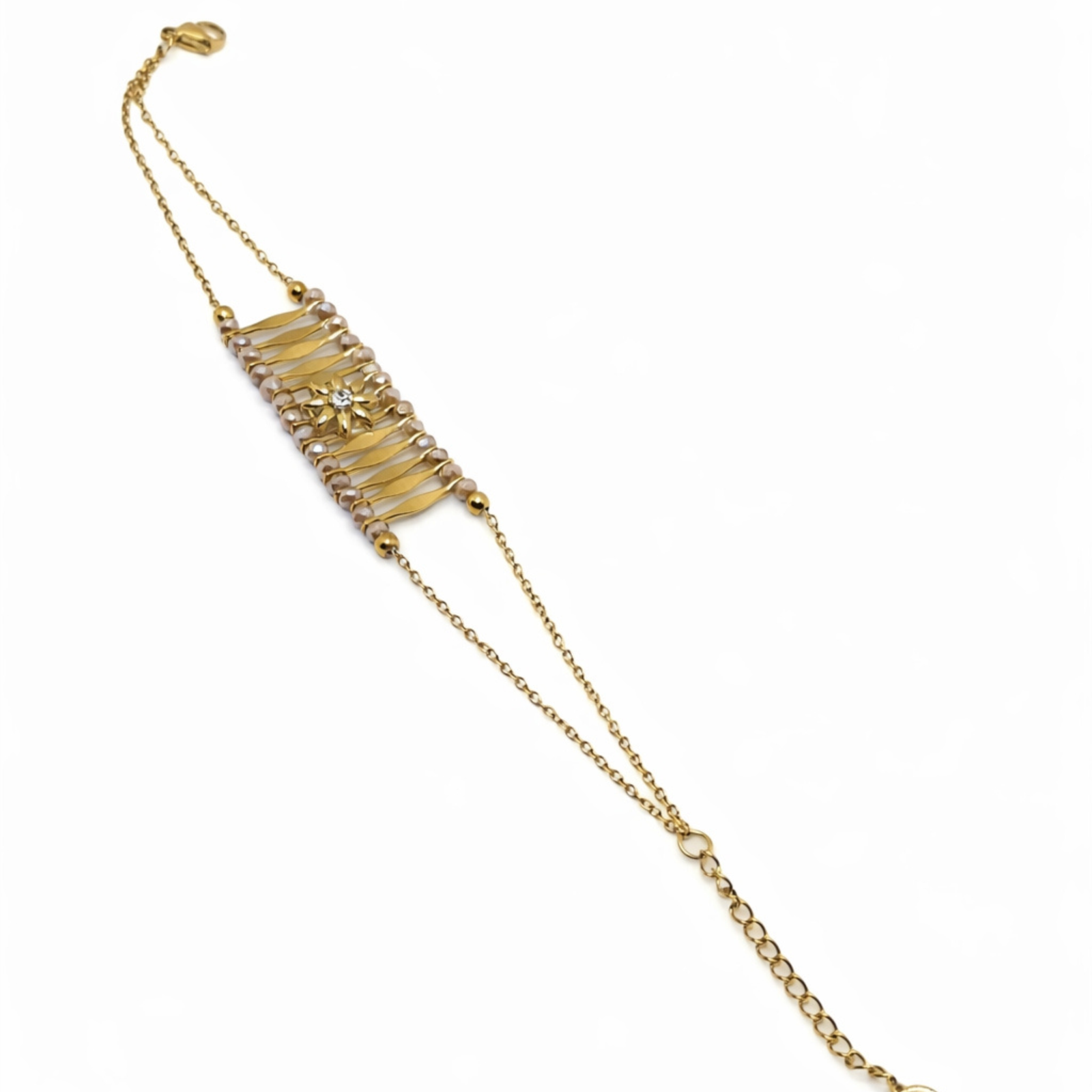 Embrace timeless charm and subtle luxury with our White Bead Floral Bracelet. This beautifully crafted piece features a unique double-layered chain accented with delicate white crystal beads and a centerpiece golden flower charm. Whether you are dressing for a wedding, a formal dinner, or adding a touch of grace to your daily wear, this White Bead Floral Bracelet is designed to complement any style.