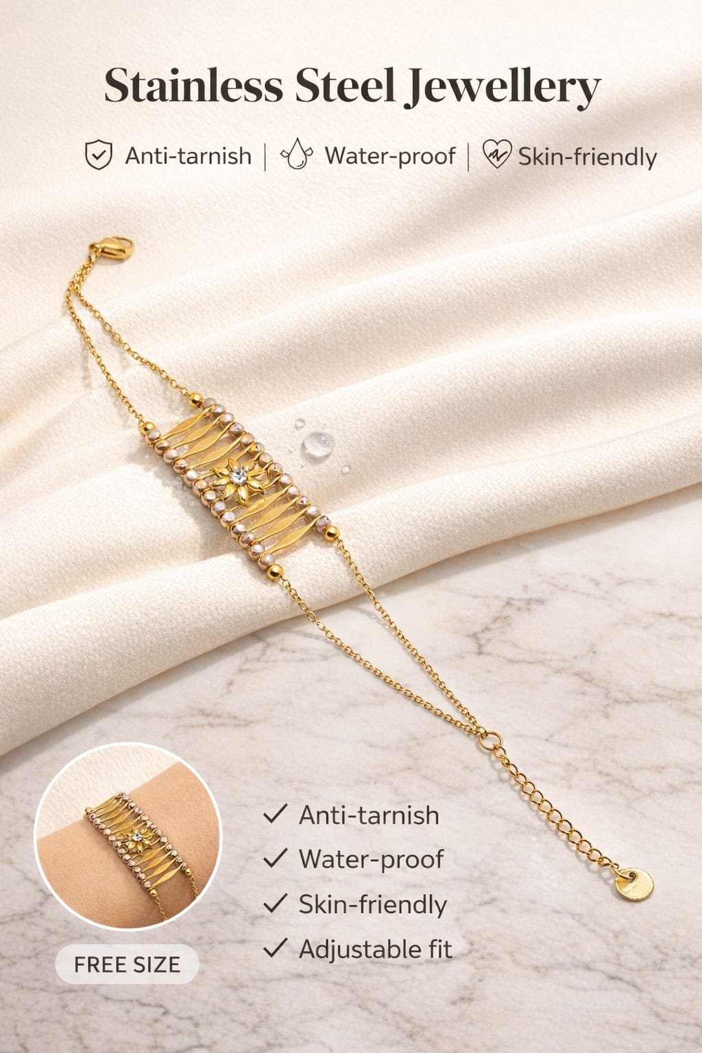 Crafted from high-grade 316L Stainless Steel, this bracelet offers exceptional durability and a premium feel. Utilizing advanced 18K Gold PVD Coating, the jewelry is 100% Waterproof and Anti-Tarnish. You can go about your day—from the gym to the shower—without worrying about the gold fading or the metal losing its brilliant luster.